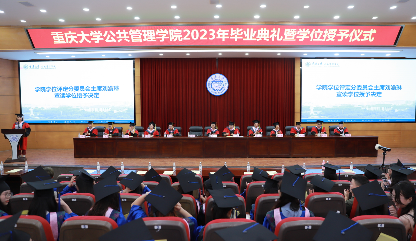 学位评定分委员会主席刘渝琳宣读学位授予决定,全场共同掌声祝贺获得学位、顺利毕业的同学。