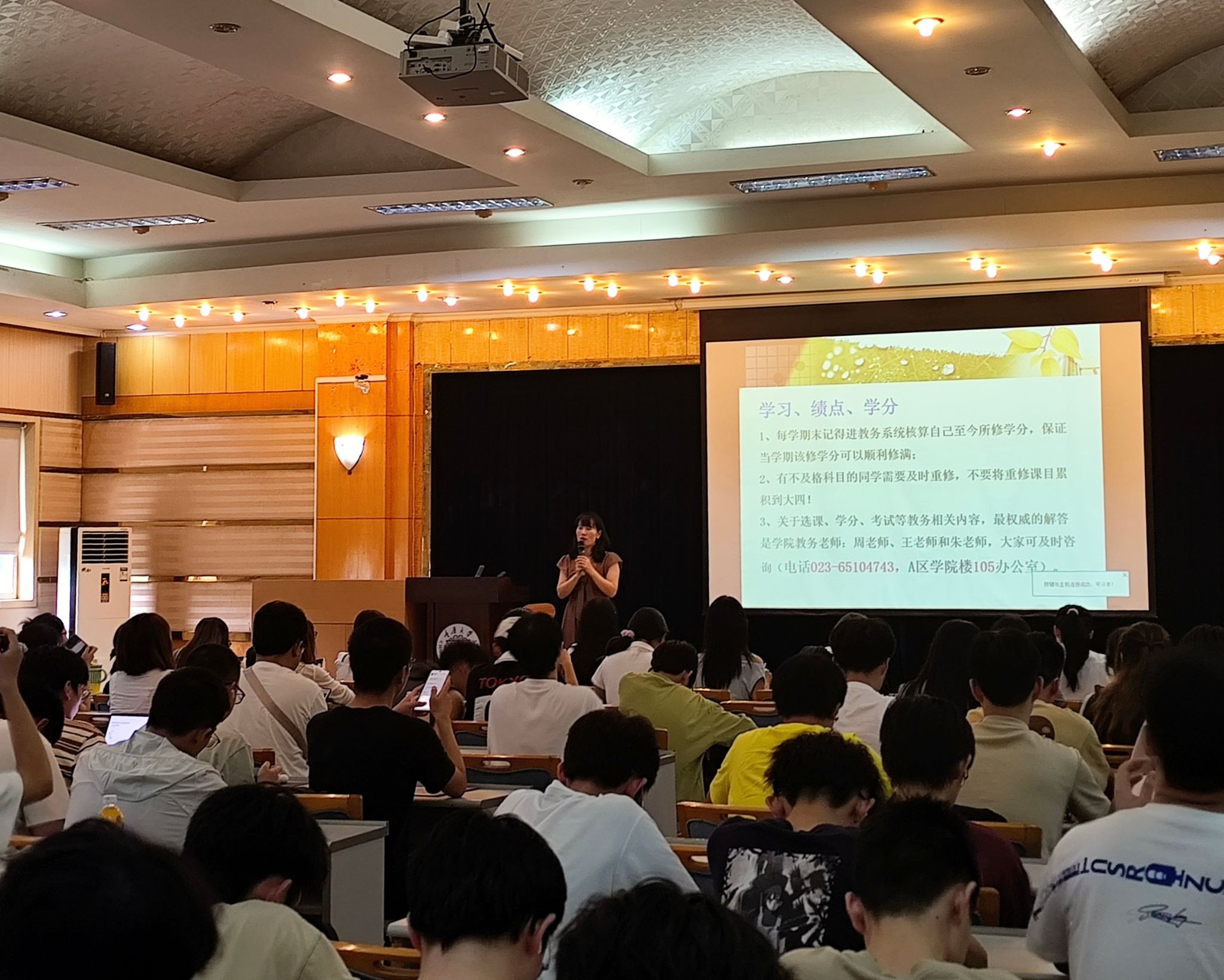 徐柳老师围绕学业发展、学风建设、生涯规划和安全教育四个方面展开讲解。学业发展与学风建设上,她提醒同学们关注学分修读情况,及时完成补考或重修,并介绍了转专业、推免政策、奖学金评定及班委选举等安排。