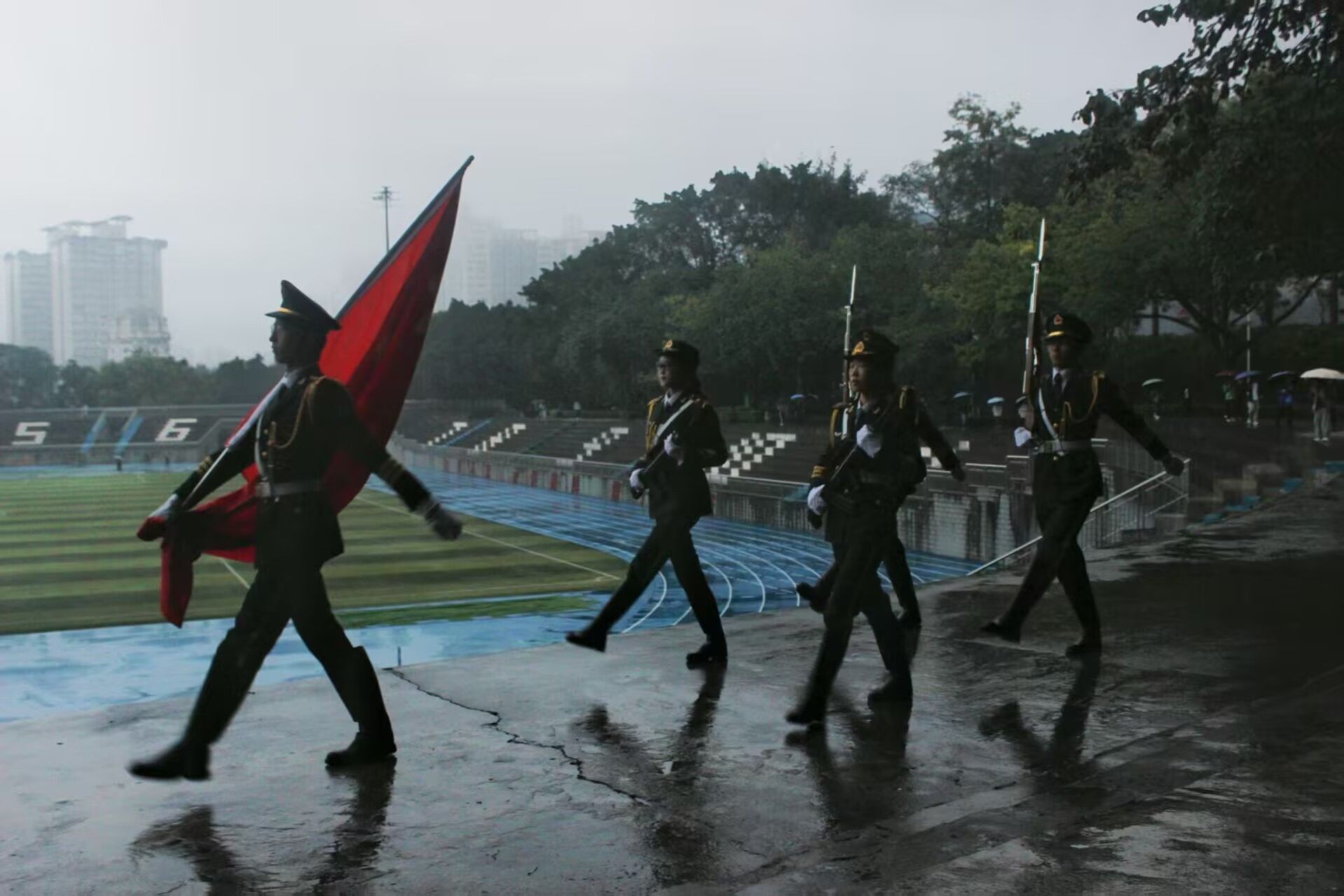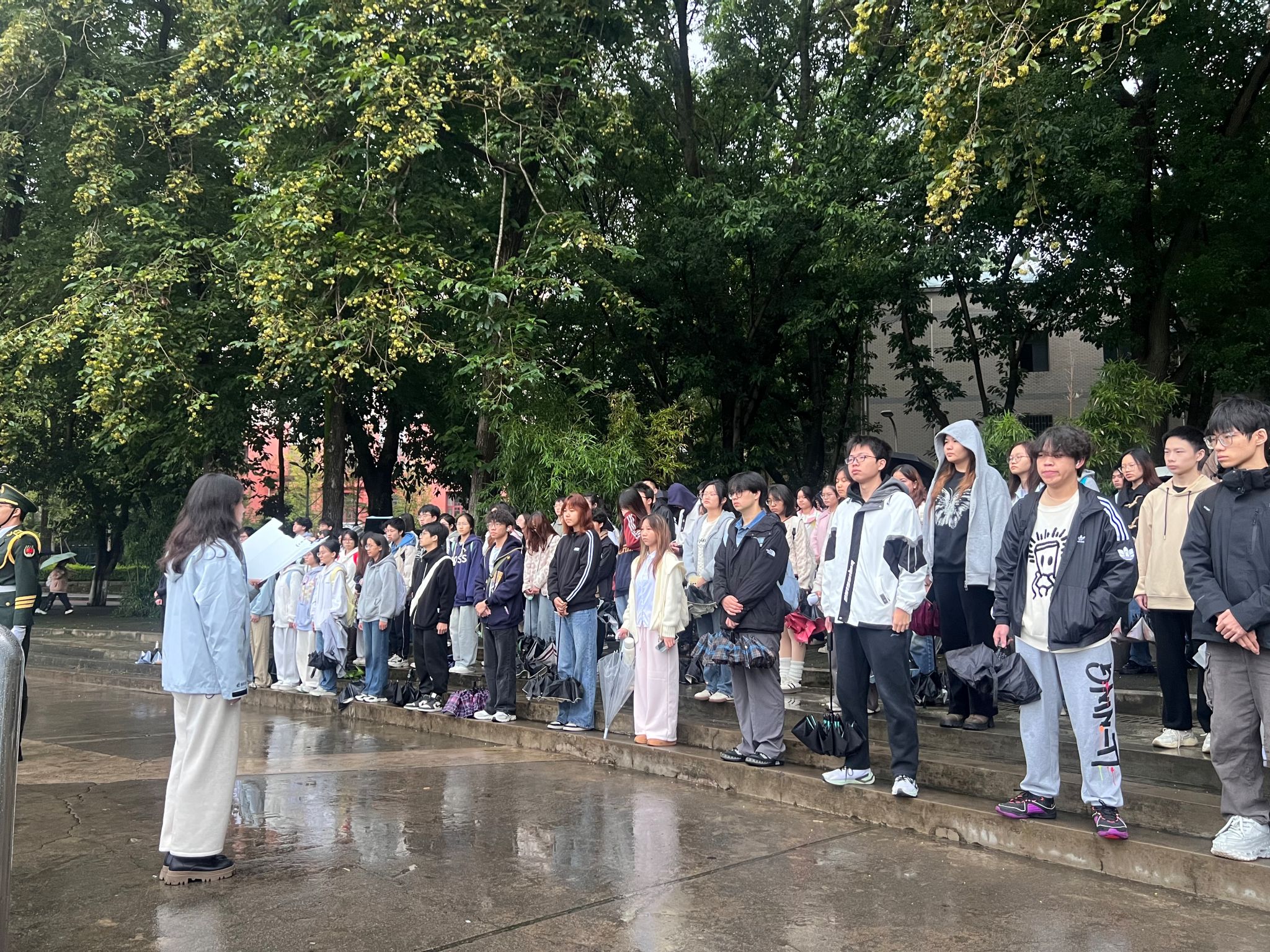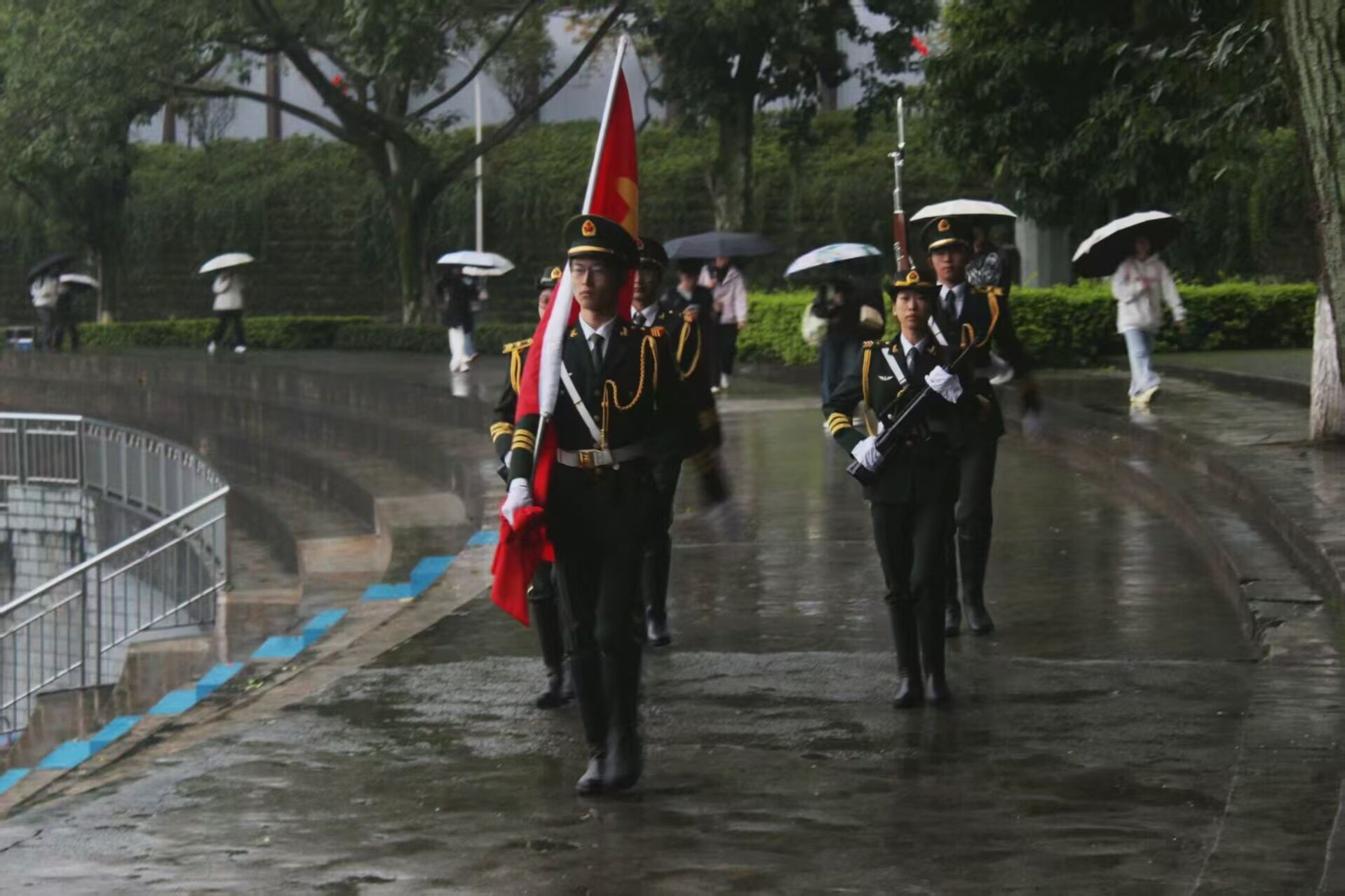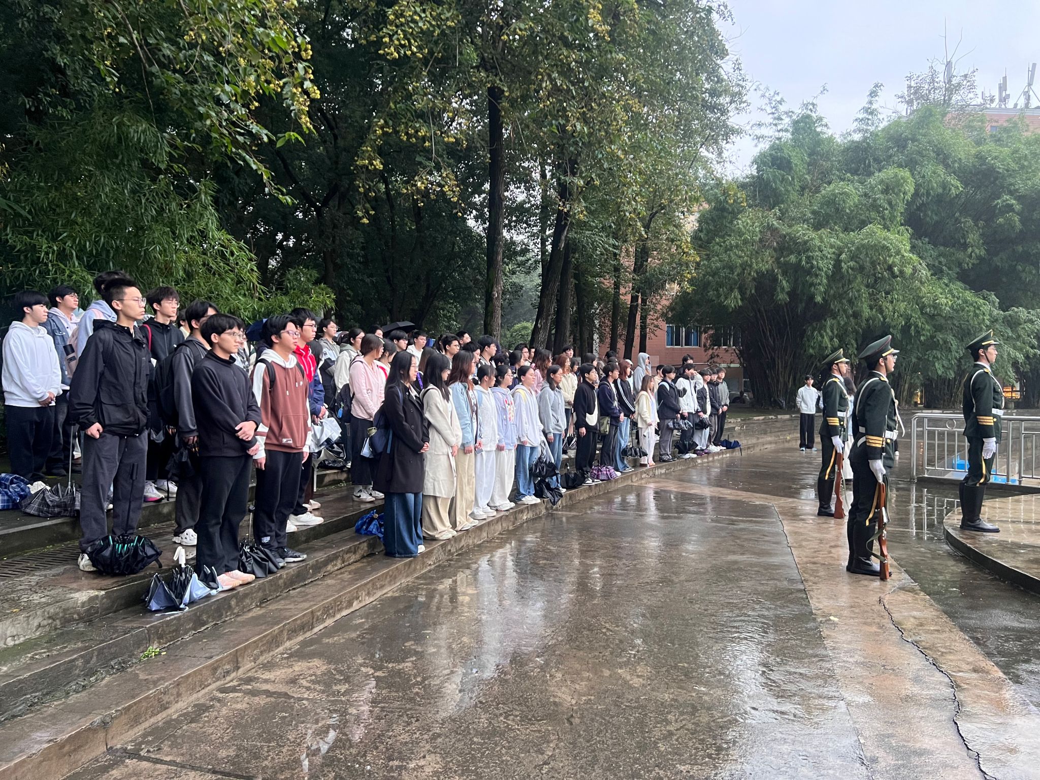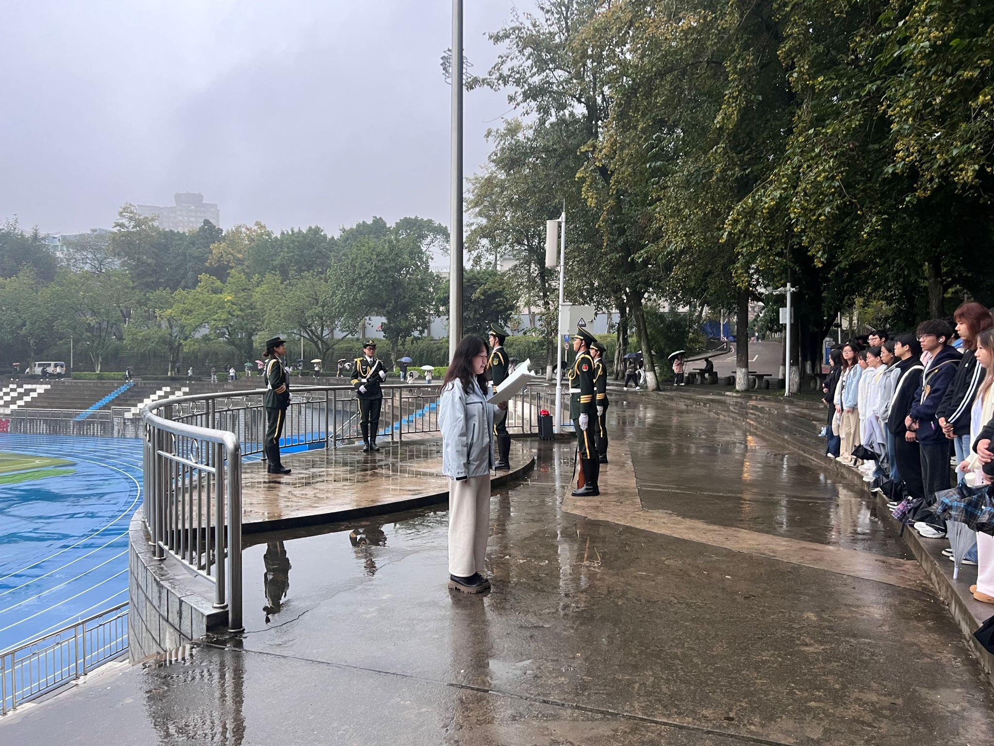 初冬清晨,晨光微露,濛濛细雨为活动增添了几分肃穆。全体学生列队整齐、肃立广场,目光聚焦于国旗行进方向。伴随着铿锵有力的步伐,肉视频