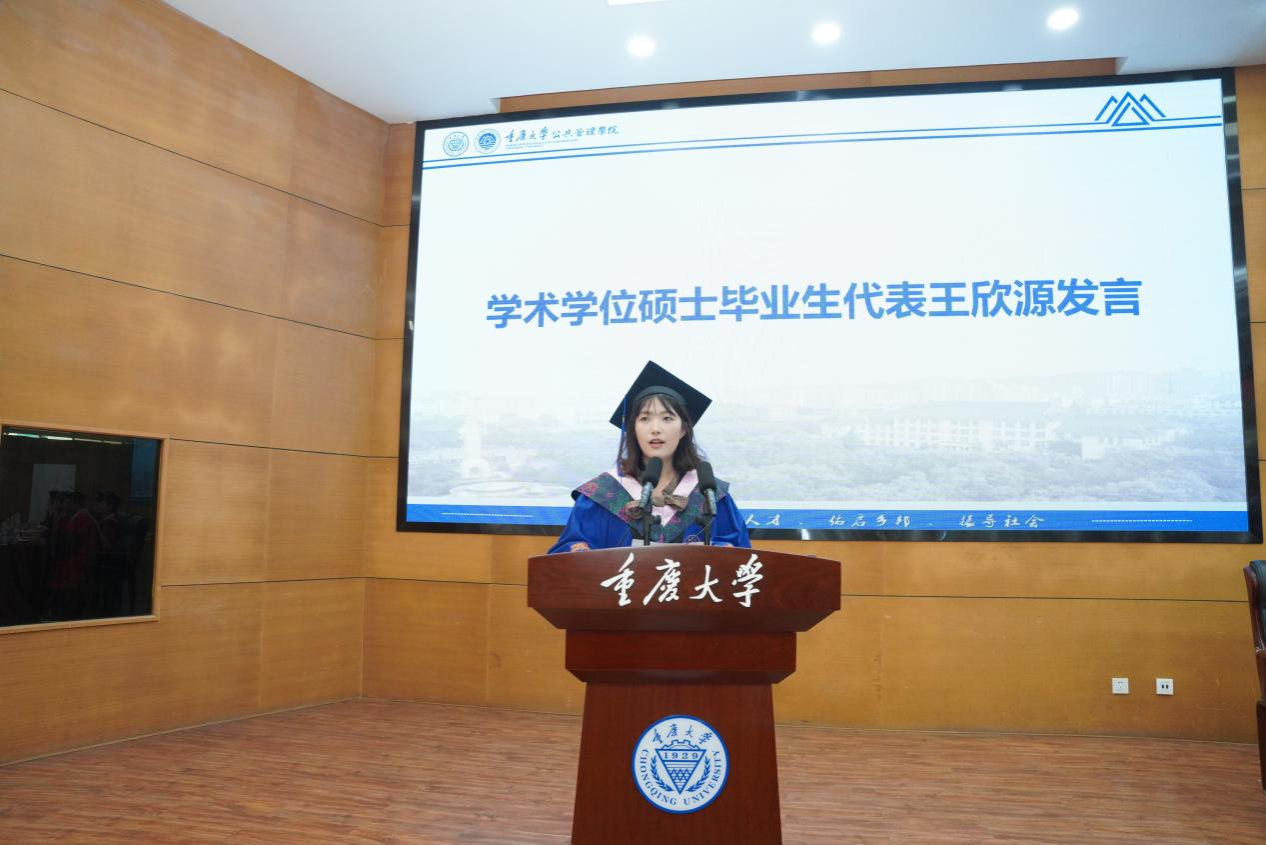 学术学位硕士毕业生代表王欣源发言,她相信2025届毕业生一定会牢记“耐劳苦,尚俭朴,勤学业,爱国家”的校训,胸怀远志、手握蓝图,昂扬思想、踏实脚步,将谱写“百年新重大”崭新篇章作为重大公管人光荣的使命,让“尚道至公,管泽天下”的精神成为重大公管人闪耀的光环。