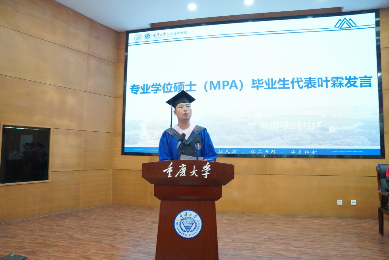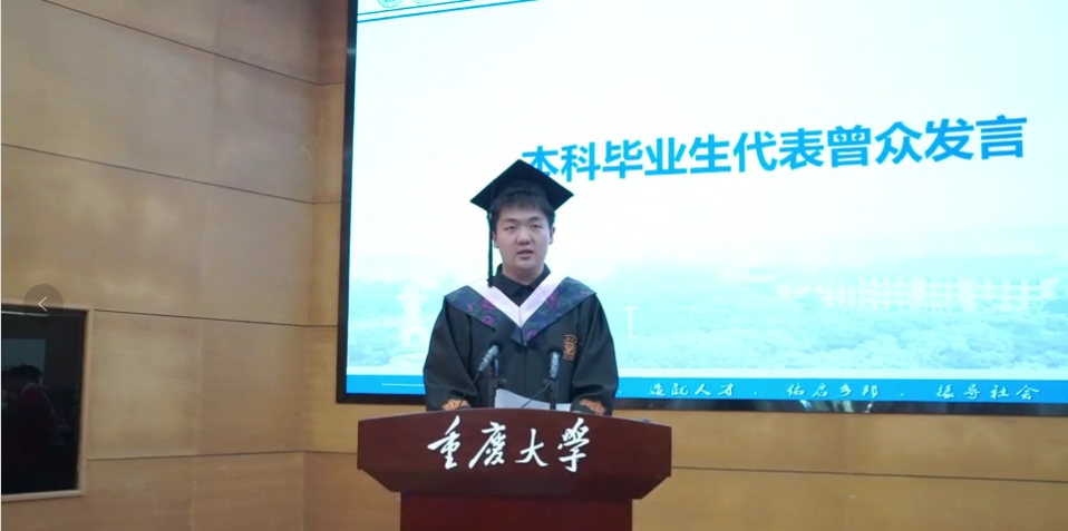 专业学位硕士毕业生代表叶霖发言,他回望了在重大的三年时光,由衷地感恩母校、肉视频