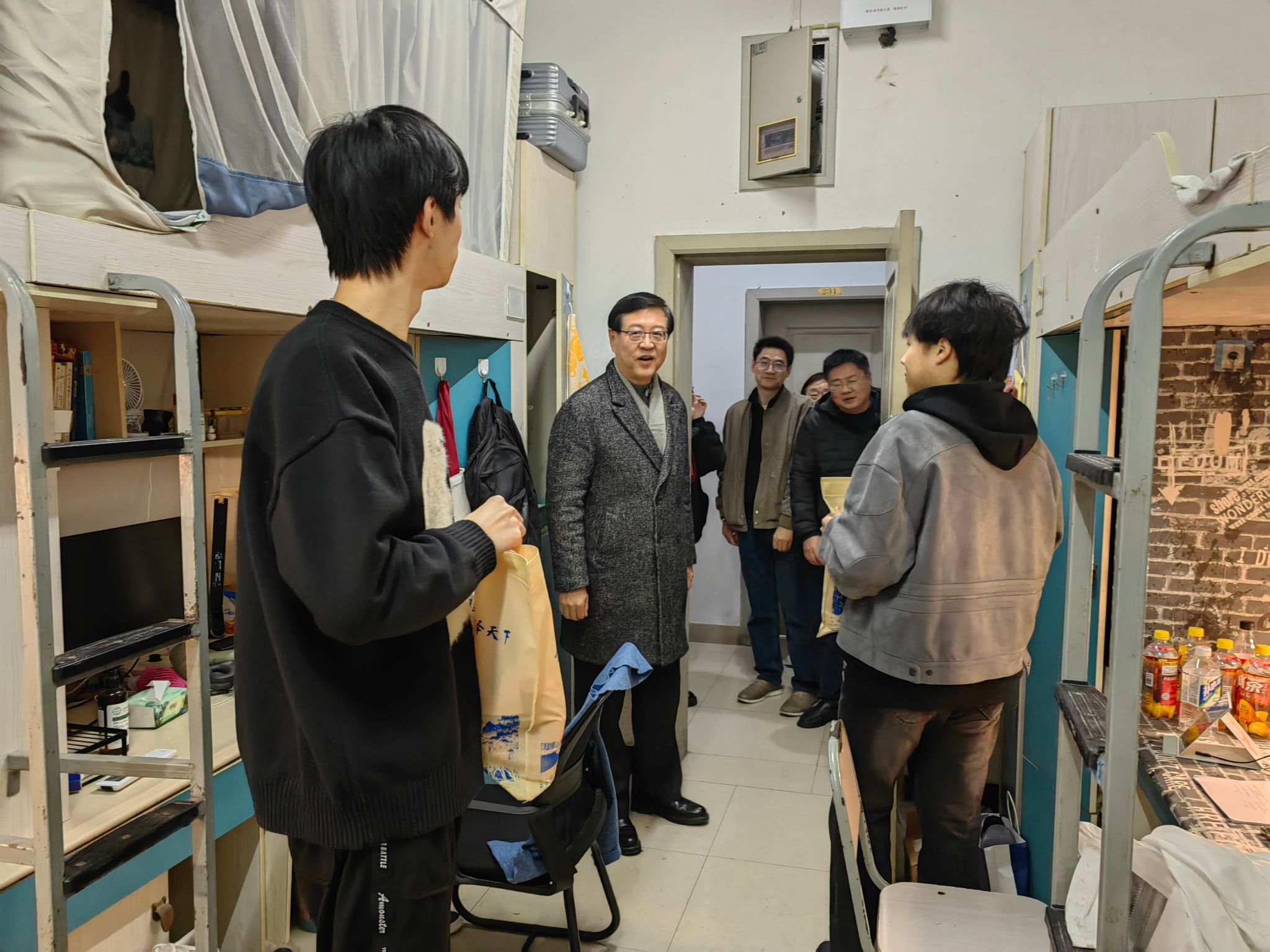 领导和老师们先后前往学生宿舍五舍和八舍对同学们进行了亲切的关怀和慰问。陈东书记鼓励同学们放平心态,轻松应考,面对压力要学会自我调节,需要时寻找老师和同学的帮助,肉视频