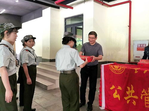 为新生们精心准备了水果大礼包,张玲书记,袁晓浩副书记和王丽娟老师亲自为同学们分发慰问品。新生们脸上洋溢着温暖的笑容,排着整齐的队伍有序领取。