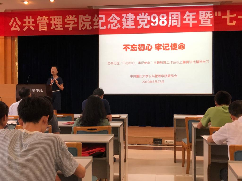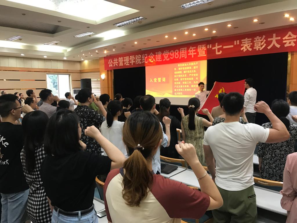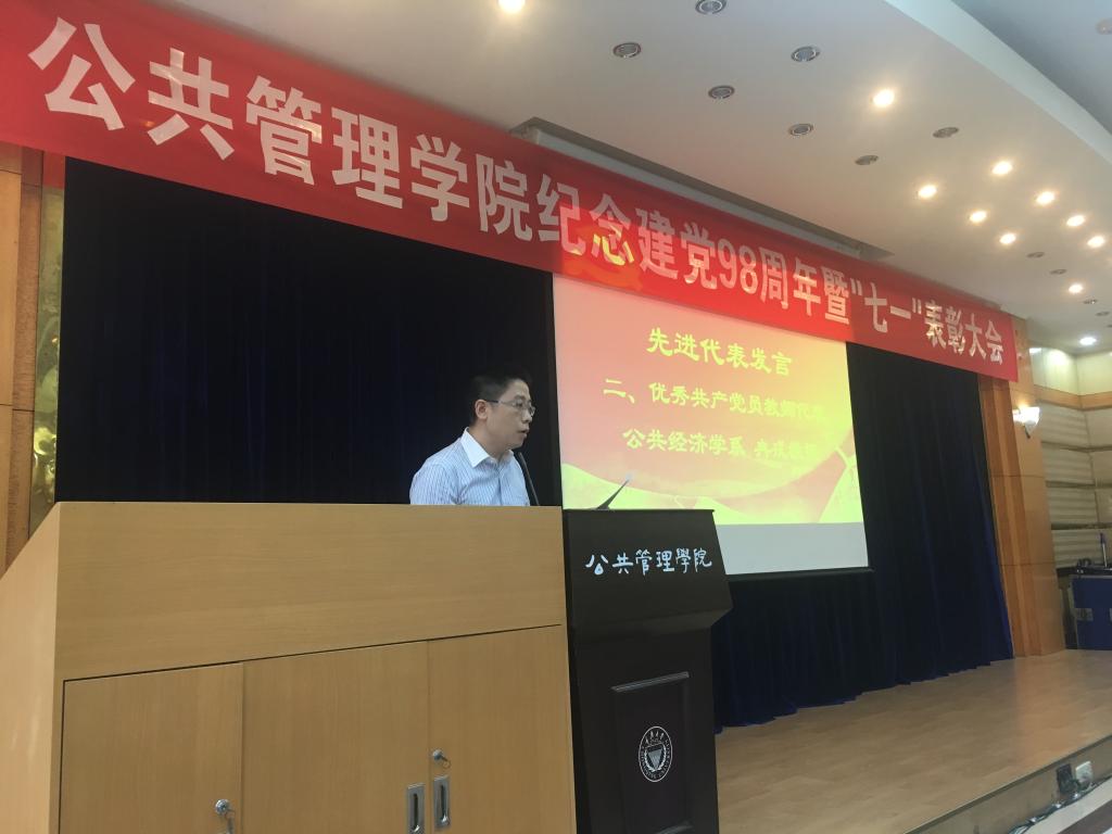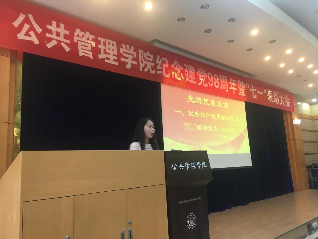 随后,优秀共产党员代表上台发言。学生代表、2017级硕士研究生吴明朗同志表示,作为青年党员,要做学术上的开拓者、服务中的表率者、理想信念的传播者,要肩负历史使命和责任担当,用青春和热血继续书写彪炳史册的壮丽篇章。教师代表、公共经济学系冉戎同志表示,首先祝贺伟大的中国共产党98岁生日快乐!今后将倍加珍惜荣誉,牢记使命和责任,潜心立德树人,把培育社会主义核心价值观贯穿于教书育人的全过程。