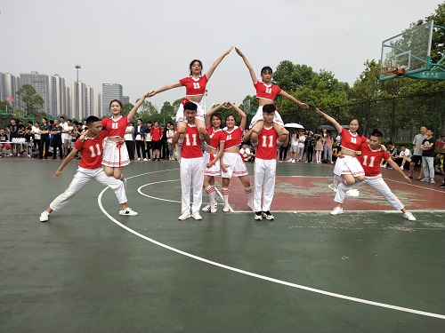 啦啦操队就以一个高难度的托举动作赢得了全场的目光和惊呼。队员们穿着亮眼的红色,踩着鼓点,舞动着手中的花球。他们一次次地完成难度系数极高的一系列动作,以最张弛有力的动作,释放着澎湃的青春热情。尽管在过程中,现场的音乐都出现了一点问题,但队员丝毫没有慌张,不忙不乱地调整动作,并最终以极高的水准顺利完赛。