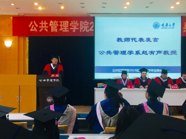 教师代表、公共管理学系赵有声教授发言。作为改革开放后第一批入学大学生的赵有声教授向圆满毕业、获得学位的同学表达了热烈的祝贺。赵教授谈起今天是毛主席的诞辰与今年是改革开放四十周年这两个不平凡的时间点,并以一个学者与教育工作者的身份回顾了四十年教育发展与公共管理学科发展的历程,梳理了肉视频