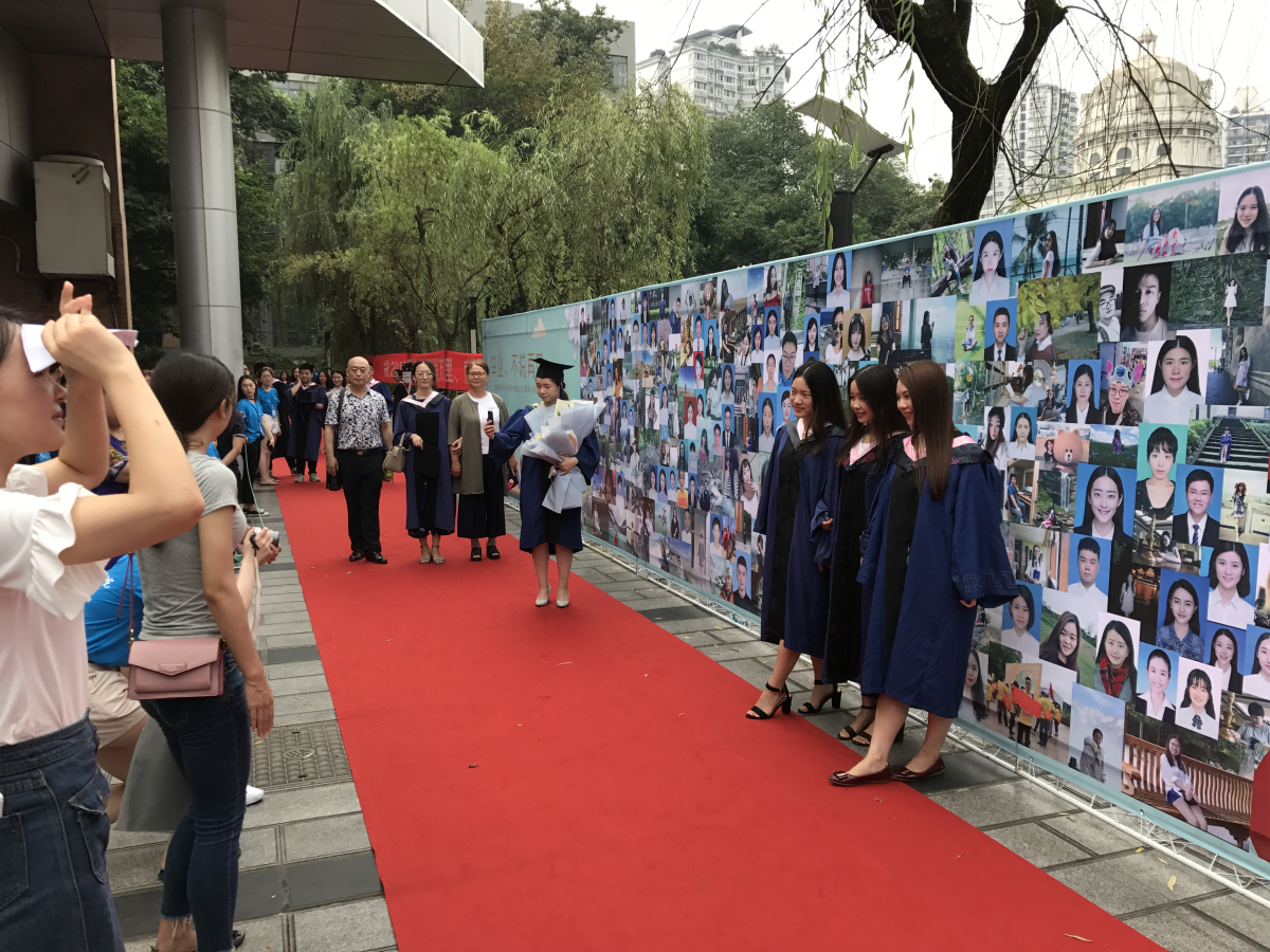 典礼开始前,全体毕业生和教师代表走过红毯,红毯旁的毕业照片墙记录着毕业生们青春洋溢的笑容与风采,走过红毯后大家在签名墙上签名并合影留念。同时,报告厅内循环播放着由肉视频