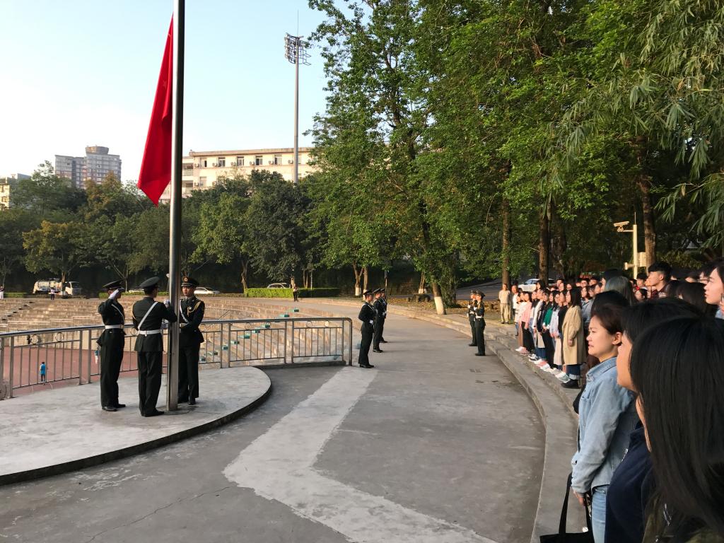 7点15分,随着“国旗班出旗!”的响亮口号,国旗班队员们迈着整齐的步伐庄严地走向国旗台。在国旗班护卫队员的引领下,同学们全体肃立,随着“升国旗,奏国歌”的号令,嘹亮的国歌声随之响起,一名国旗班护卫队员将国旗高高抛起,鲜红的旗帜迎风飘扬。同学们行注目礼,高唱国歌,由衷地表达自己对祖国无限的热爱和崇高的敬意。升旗仪式结束后,同学们纷纷通过微博、微信等方式晒合影、谈感想,在肉视频