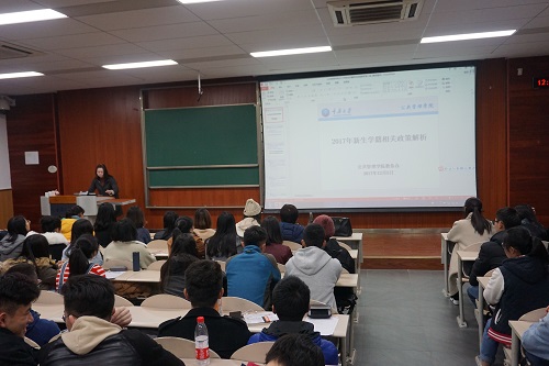 随后,教务处的老师们向大家具体介绍了怎样选课、排课、双休等信息。他们用PPT的形式展示了2017级公共管理大类以及经济学大类第二学期的课程设置和毕业学分要求。第二学期的课程有所变化,VB程序设计、微观经济学、社会学等课程进入同学们视野。