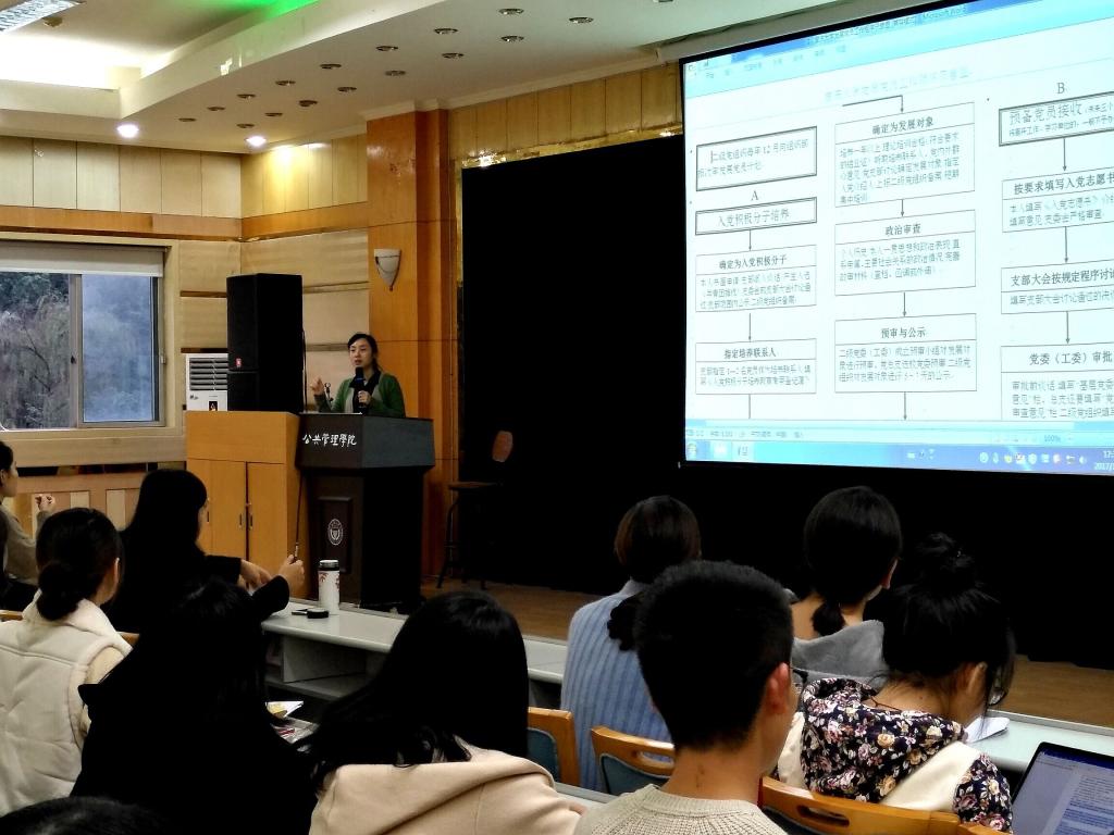 党委副书记、纪委书记刘淳主持,由组织员、研究生辅导员何薇老师主讲。