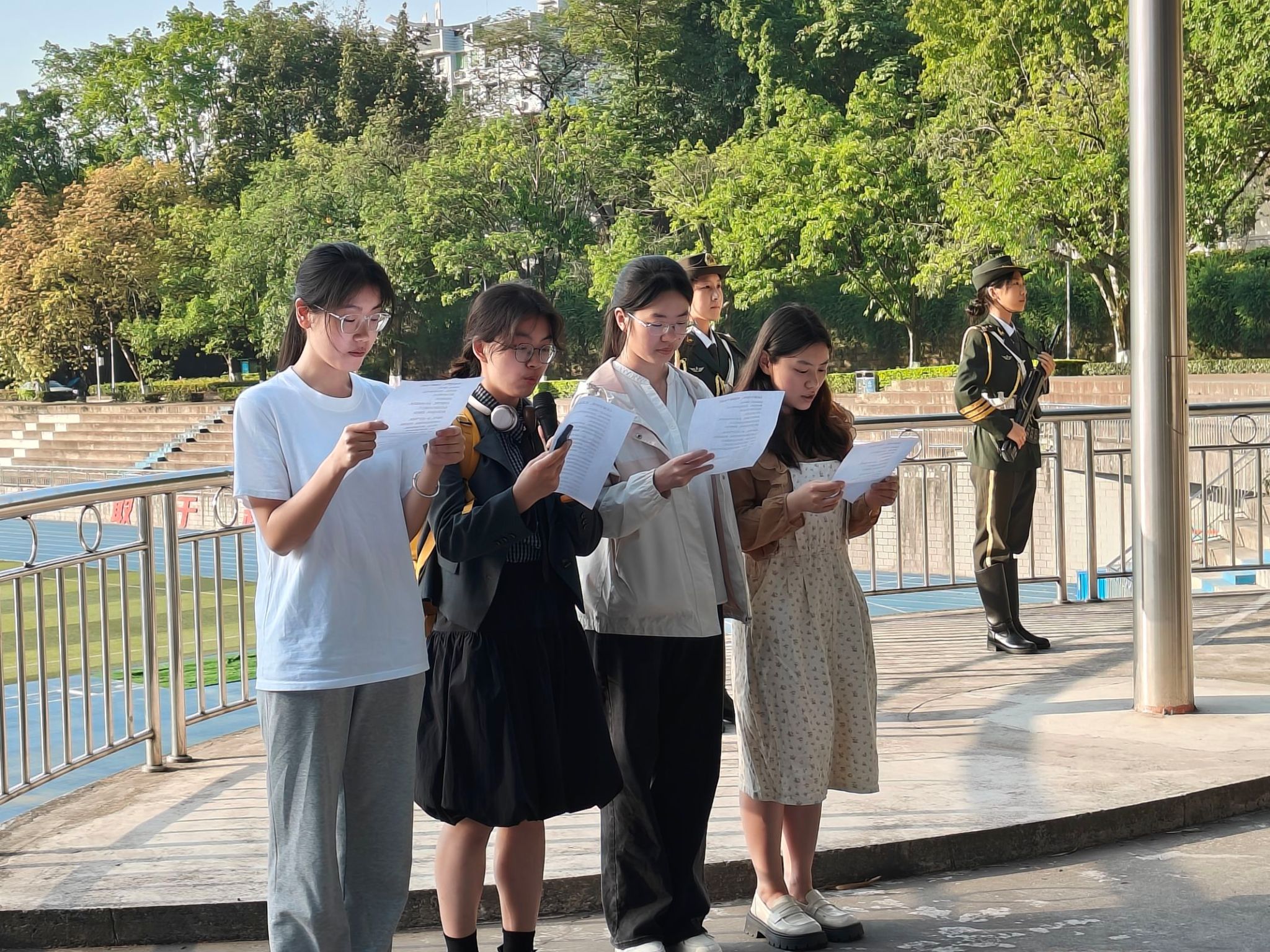 随后在国旗下,四位党员代表阙丽青、徐琪琦、蒋欢、冉晨雨进行了国旗下诗朗诵。全场肃立,目送着飘扬的国旗,聆听着四位同学声情并茂的朗诵,年轻的面庞在朝阳下闪耀着信仰的光辉。