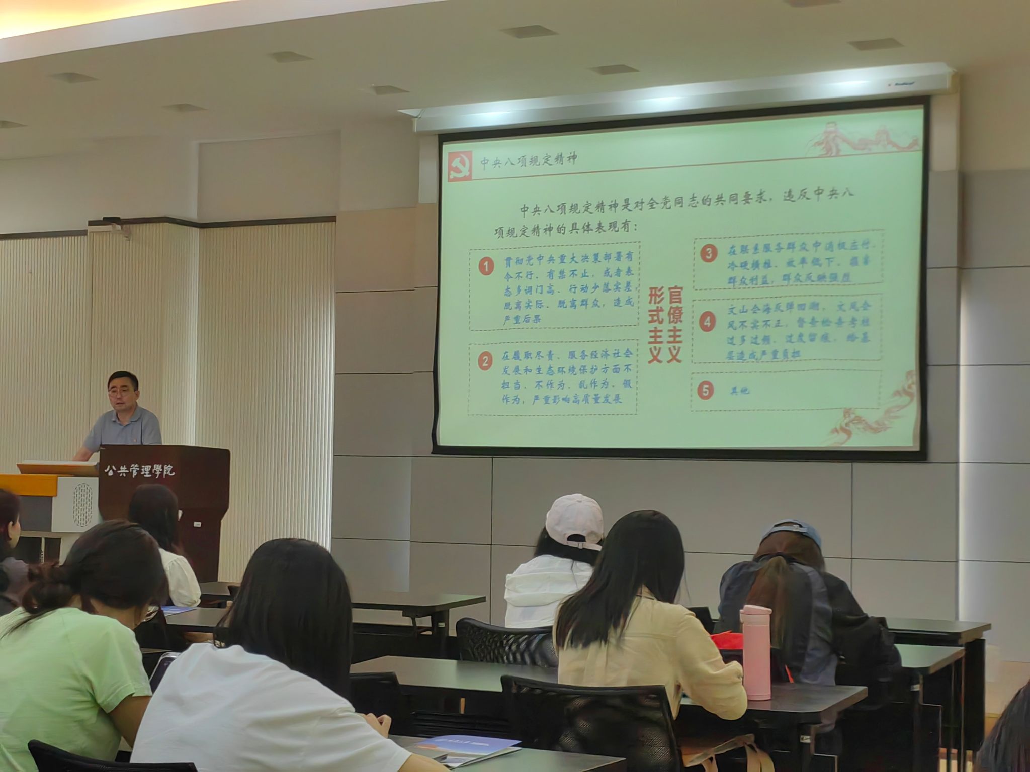 汪涛教授从深入贯彻中央八项规定精神学习教育的重要意义、目标要求、精神内容、相关制度规定和违反中央八项规定精神典型案例五个维度展开系统讲解,并结合亲身经历,严肃指出:“从中央到基层,我们党对‘踩红线’、闯‘雷区’的作风问题始终坚持零容忍态度。”他强调,八项规定是全面从严治党的“金色名片”,是密切党同群众血肉联系的“关键纽带”,更是肉视频