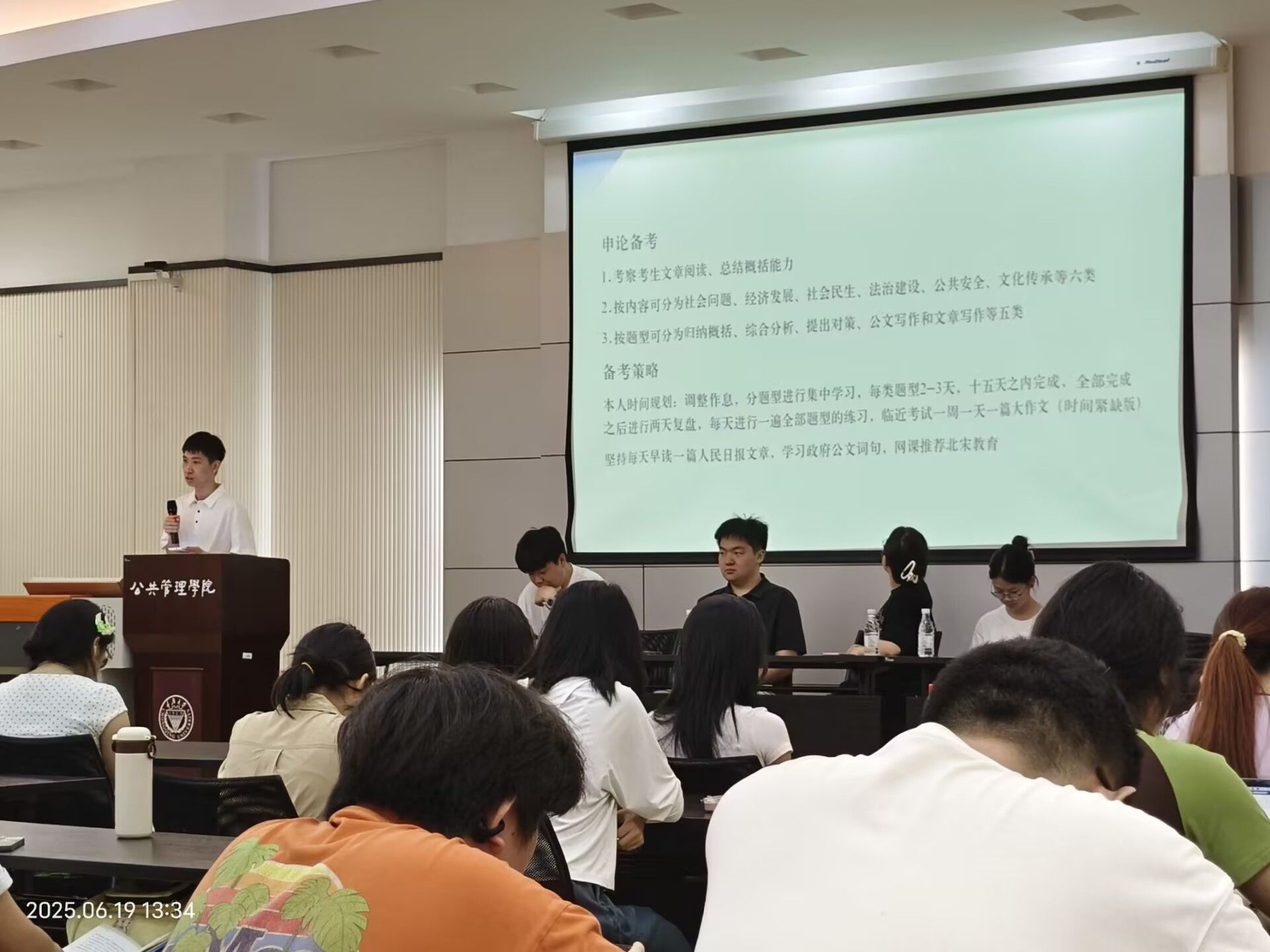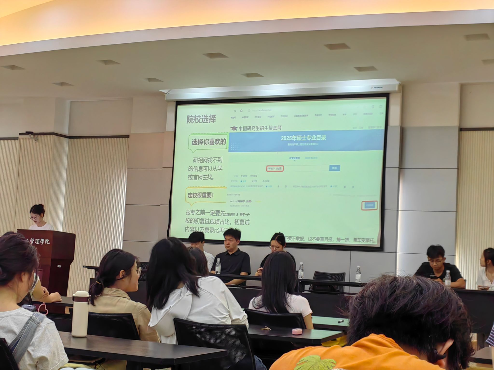 21级学姐黄佳佳上岸上海财经大学,为大家拆解“三轮复习法”。她特别强调“信息差突破”——要主动关注目标院校官网动态,和研友共享资源,避免闭门造车。21级李知楠学姐上岸厦门大学,她给大家分享“时间颗粒度管理法”:将复习任务拆解到“每小时”,用“番茄钟+复盘本”对抗焦虑和拖延。