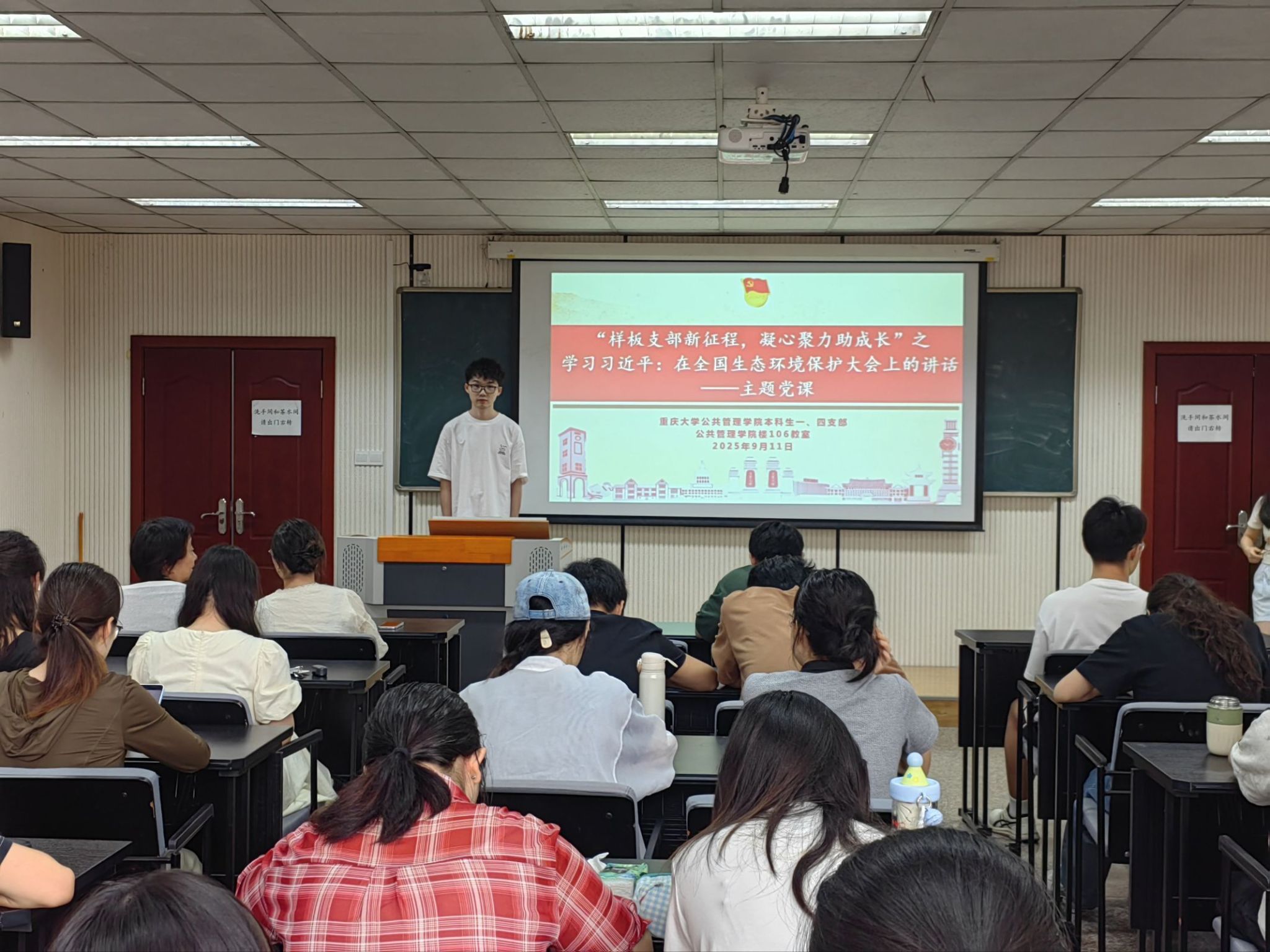 楼106教室举行“样板支部新征程,凝心聚力助成长”之“学习习近平总书记重要讲话精神,共筑美丽中国新征程”主题党课活动。本次活动深入学习贯彻习近平总书记在全国生态环境保护大会上的重要讲话精神,结合党中央关于生态文明建设的决策部署,系统总结新时代我国生态环境保护成就,明确新征程生态文明建设的重点任务与实践路径。活动由本科生一支部书记王丽娟支持,本科生四支部党员朱雨主讲,一、四支部全体党员、预备党员积极参与。