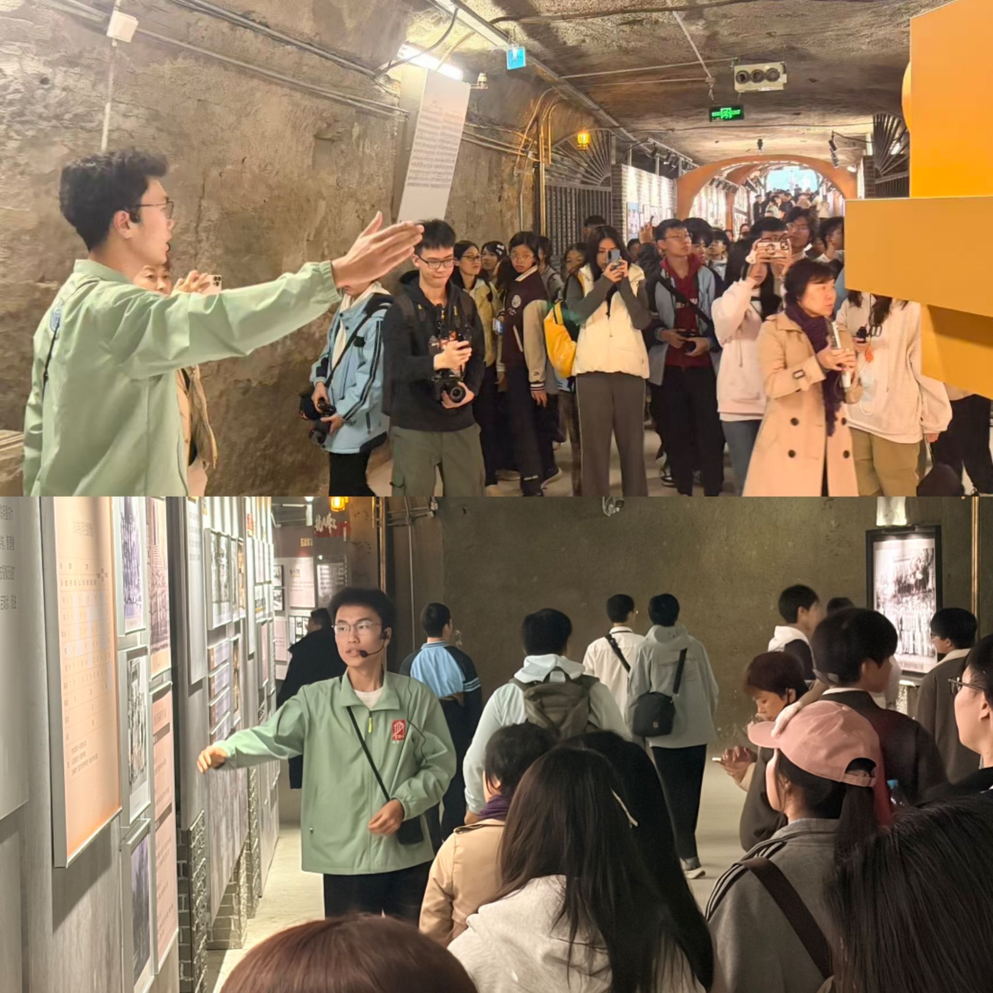 沙坪坝校区A校园内的防空设施,为全国高校现存修建时间较早且规模最大的防空洞。在参观过程中,讲解员结合历史背景与实物遗存,详细介绍防空洞的建设历程、抗战时期的战略作用及校园历史变迁,让师生们在沉浸式参观中感受红色底蕴与文化传承,搭建起校际交流的生动桥梁。