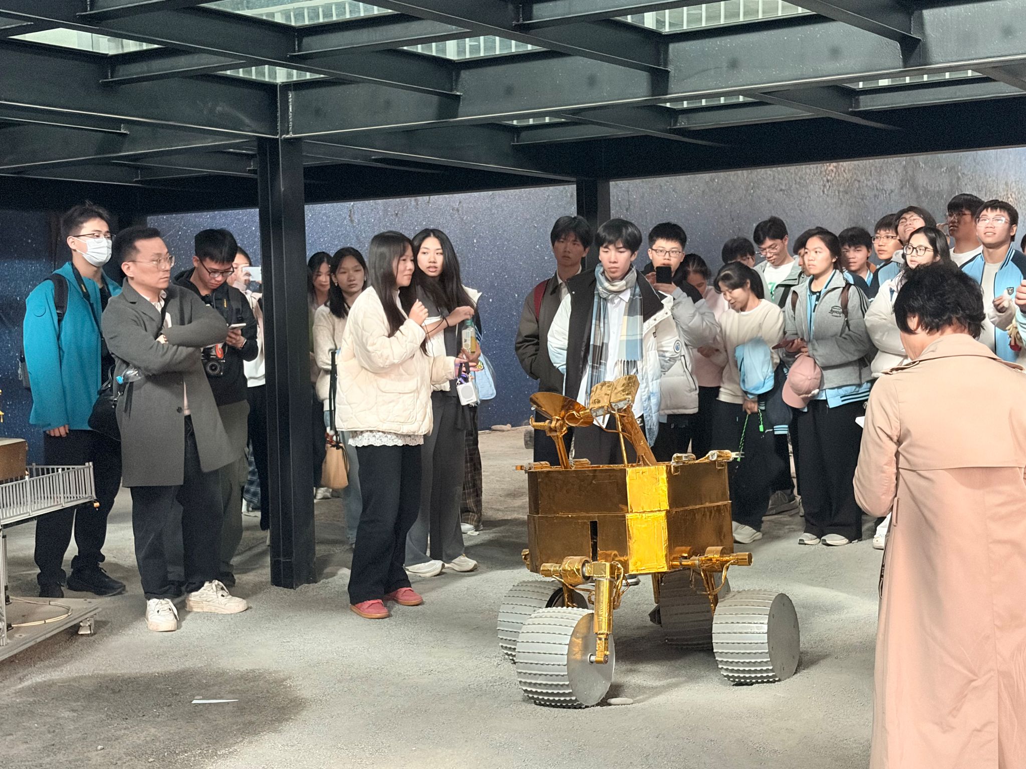教育部深空探测联合研究中心,深空探测中心杨老师全面介绍了四轮三轴月球车、端抱式月面巡视器转移释放机构、生物科普试验载荷等主要成果,并告诉同学们科学研究往往来源于生活,如端抱式月面巡视器转移释放机构就是模拟大人将小孩从高处抱下来的动作将月球探测车放置到月球背面,鼓励同学们多思考,多观察。激发了在场师生对我国航天事业的热爱,增强了学生的民族自豪感。