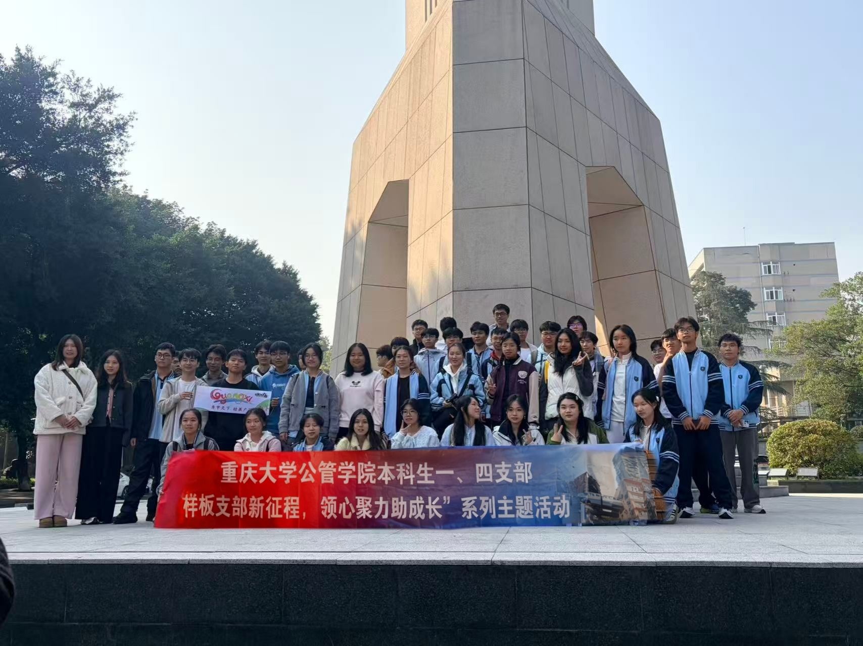 沙坪坝校区A校园钟塔拉开序幕。王丽娟及支部党员们为远道而来的南宁三中研学团队表达了热烈而真挚的欢迎之情,并介绍了活动的流程:防空洞参观、校园参观、集体合影及参观深空探测联合研究中心。