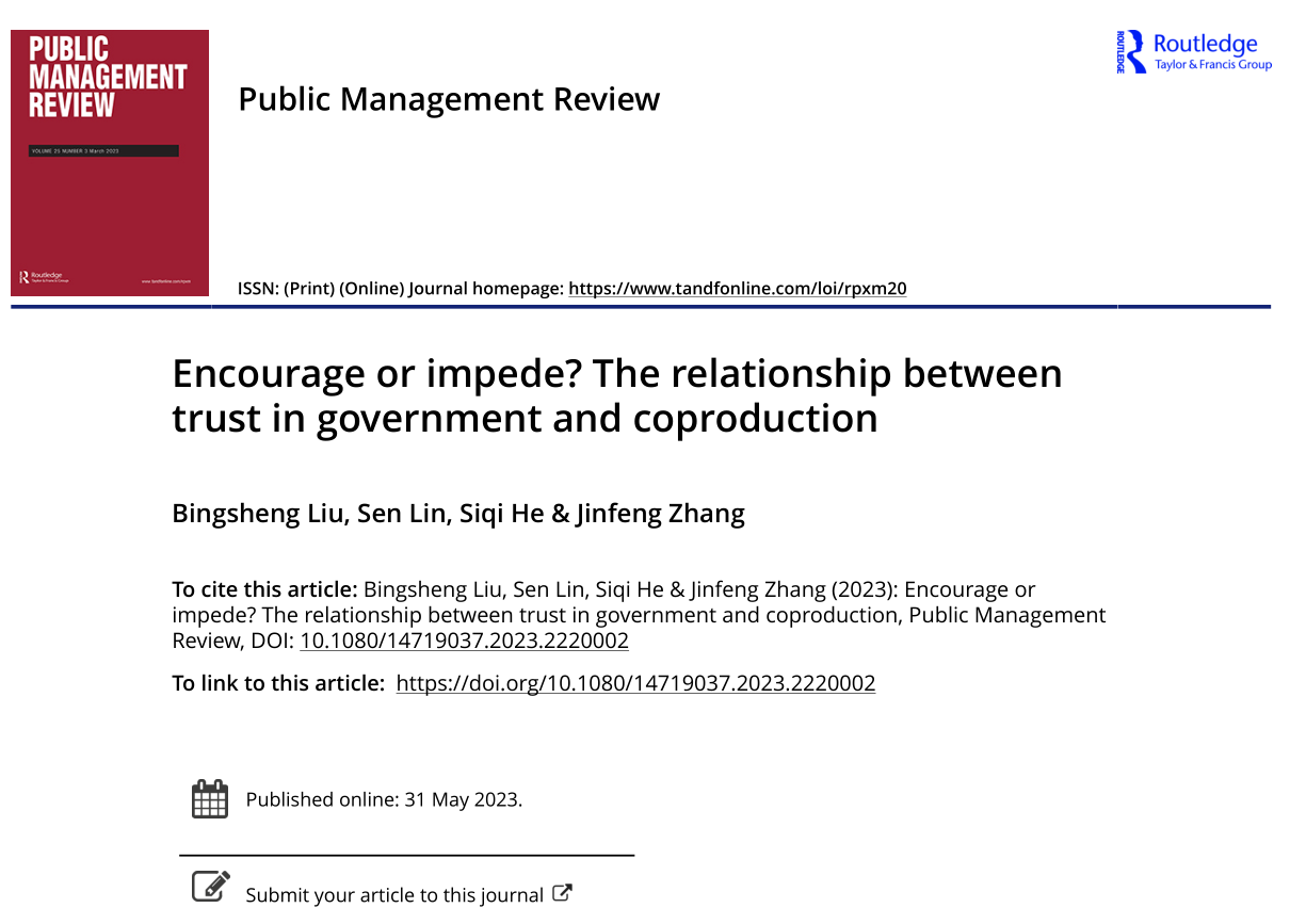 刘炳胜教授作为第一作者的研究成果“Encourage or impede? The relationship between trust in government and coproduction”在公共管理学科顶尖期刊Public Management Review发表,该期刊JCR影响因子在公共管理类SSCI期刊中排名前三。该文章由刘炳胜教授及其指导的硕士研究生林森(肉视频