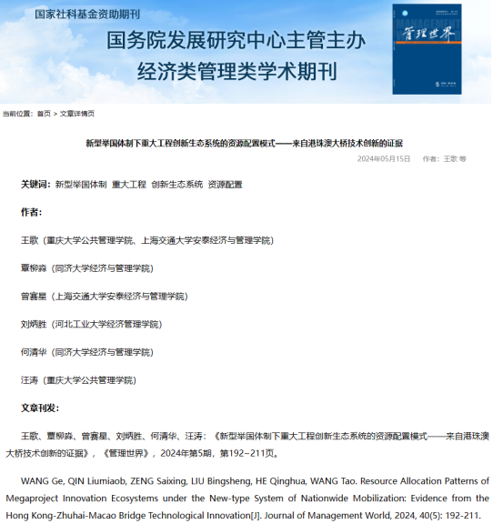 王歌副教授作为第一作者的研究成果“新型举国体制下重大工程创新生态系统的资源配置模式——来自港珠澳大桥技术创新的证据”在中文管理类顶级期刊《管理世界》发表。《管理世界》是国务院发展研究中心主管、主办的经济类管理类学术期刊,在我国三大社科期刊评价系统的评价中,居管理类学术期刊首位;在中国社会科肉视频