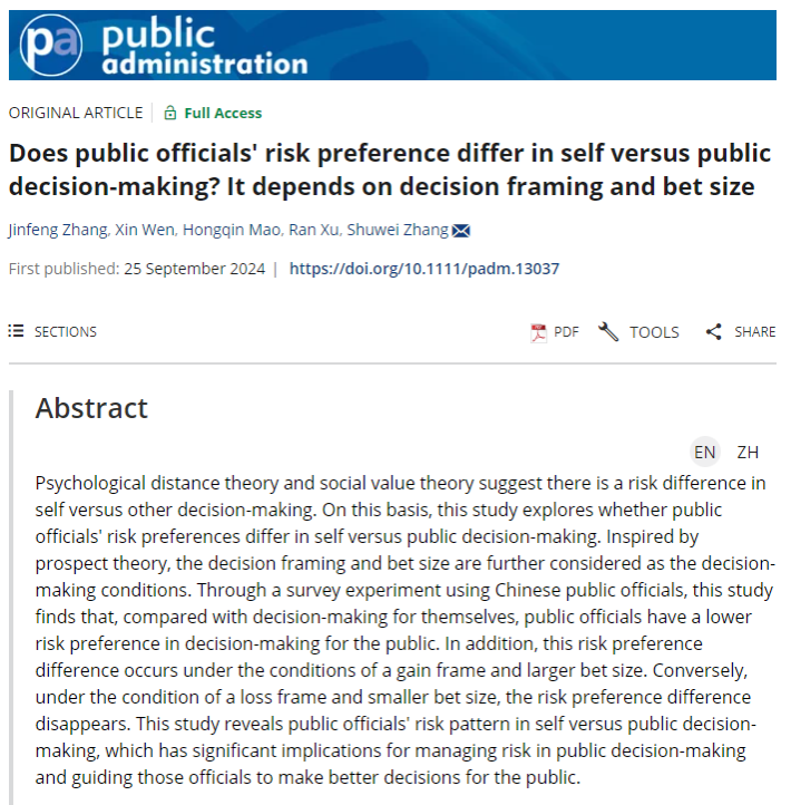 张金凤副教授作为第一作者的文章《Does public officials' risk preference differ in self versus public decision-making? It depends on decision framing and bet size》在公共管理学科高水平期刊Public Administration在线发表。Public Administration是当今历史最悠久的国际公共管理学杂志之一,JCR影响因子在政治学和公共管理期刊中长期名列前茅。该论文是由张金凤及其指导的硕士研究生温馨(论文第二作者,肉视频