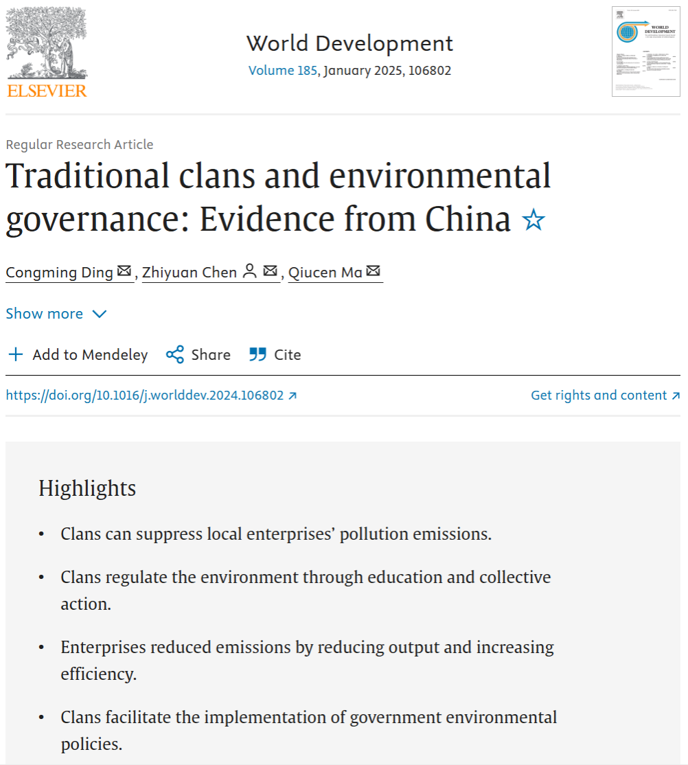 丁从明教授作为第一作者的文章《Traditional clans and environmental governance: Evidence from China》在经济学科高水平期刊World Development在线发表。World Development是发展研究(Development Studies)领域的国际顶级刊物,影响因子在发展研究和经济学期刊领域中长期名列前茅,属于JCR1区和中科院一区Top期刊。该论文是由丁从明教授及其指导的硕士生陈致远,博士生马秋岑共同完成。是近年来在肉视频