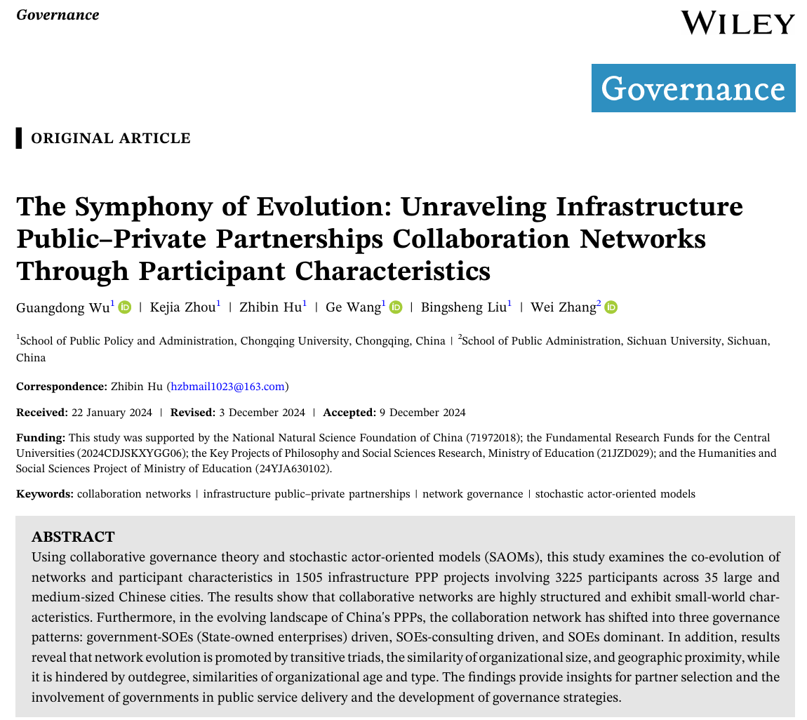 吴光东教授作为第一作者、胡志斌(2020级博士研究生)作为通讯作者的研究成果“The Symphony of Evolution: Unraveling Infrastructure Public–Private Partnerships Collaboration Networks Through Participant Characteristics”在公共管理学科顶尖期刊Governance发表。