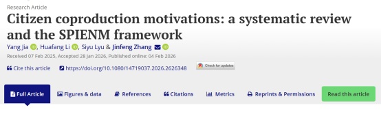 21级直博生贾杨作为第一作者、张金凤教授作为通讯作者的研究成果“Citizen coproduction motivations: a systematic review and the SPIENM framework”在公共管理学科顶尖期刊Public Management Review发表。该期刊在管理学类别中位于一区(Q1),影响因子在公共行政和公共政策领域SSCI期刊中位列前茅,是公共管理学科五大顶尖期刊之一,ABS 4星期刊。该文章由肉视频