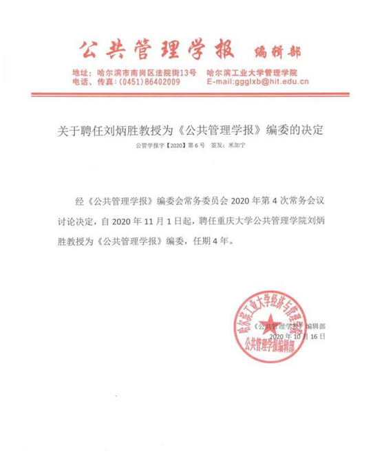 Recently, after the 4th executive meeting of the "Journal of Public Management", Professor Liu Bingsheng, Dean of the School of Public Policy & Administration, was appointed to be a member of editorial boards for 4 years since Decemeber 1st, 2020.