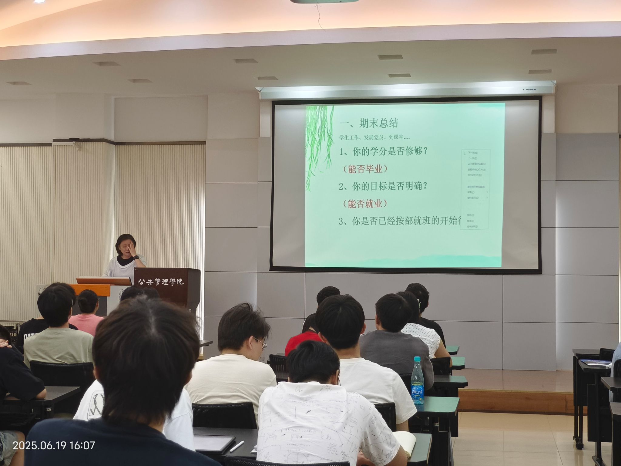会议的第四部分是大四上学期相关事宜安排。大四上学期是大学阶段的最后冲刺期,也是从校园到职场或升学的关键过渡阶段。学业收尾、职业规划、个人成长和心理调整均在这一时期集中起来,其决策与行动将直接影响未来发展轨迹。因此同学们更要加强对消息的把握,例如开学时间、学分核查与补修、班委换届、保研入党等等。