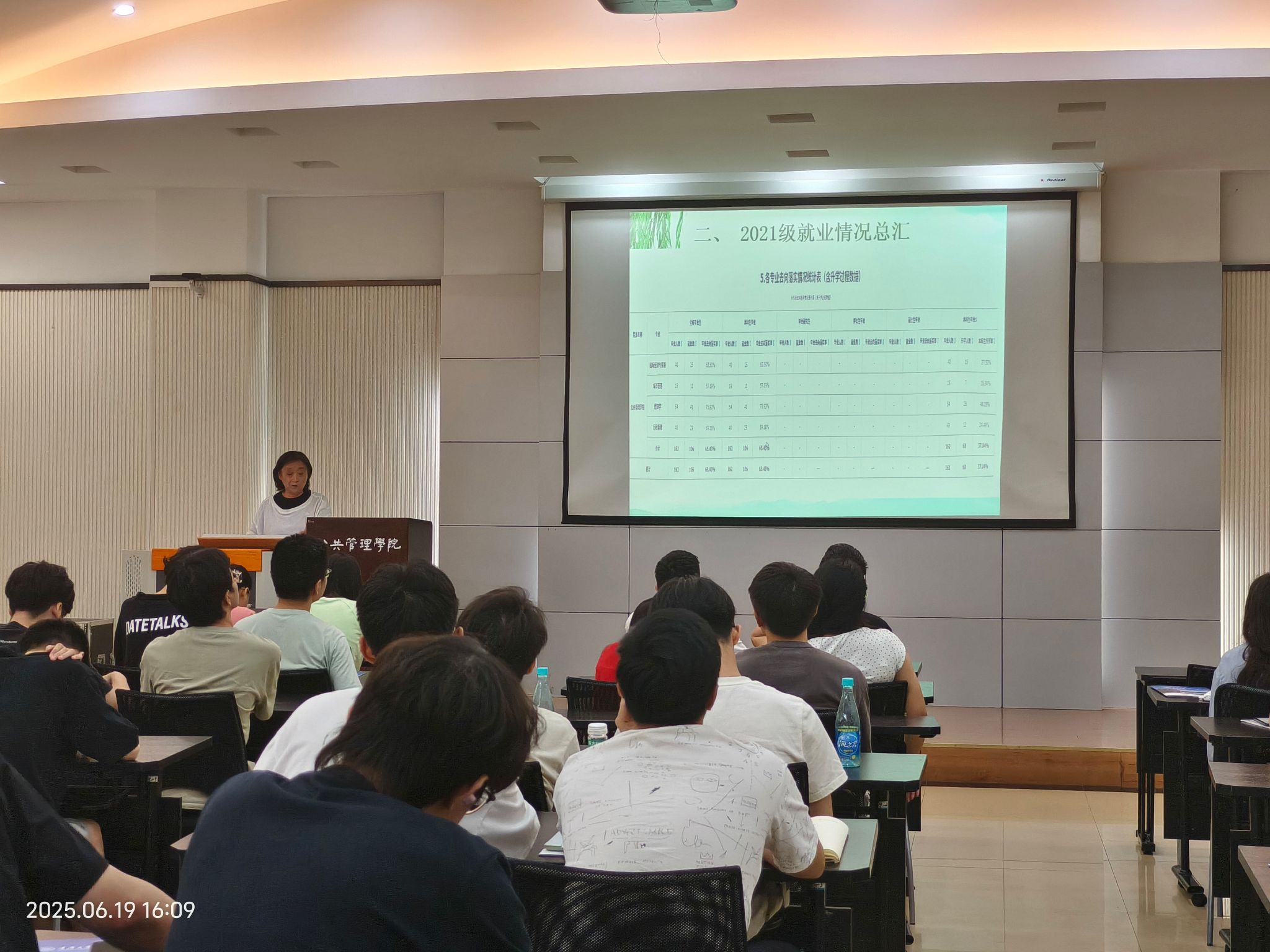 会议的第二部分是2021级就业情况总汇。王老师根据2021级就业情况总汇为同学们分析了上一届学长学姐的毕业去向情况,为同学们提供参考与帮助。