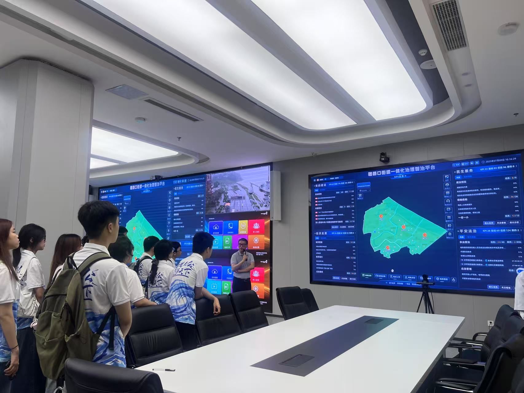 指挥中心李城委员热情接待了实践团一行。李委员开宗明义地介绍了中心的定位:“我们是全市党建统领‘一中心四板块一网格’基层智治体系中的‘一网格’,是体系的执行末端和关键节点。”他引导实践团观看指挥大屏上展示的“磁器口街道‘141’基层智治指挥执行体系构架图”,并详细说明:“我们围绕党的建设、经济发展、民生服务、平安法治四大核心板块,整合职责、优化流程,确保指挥执行高效精准。”