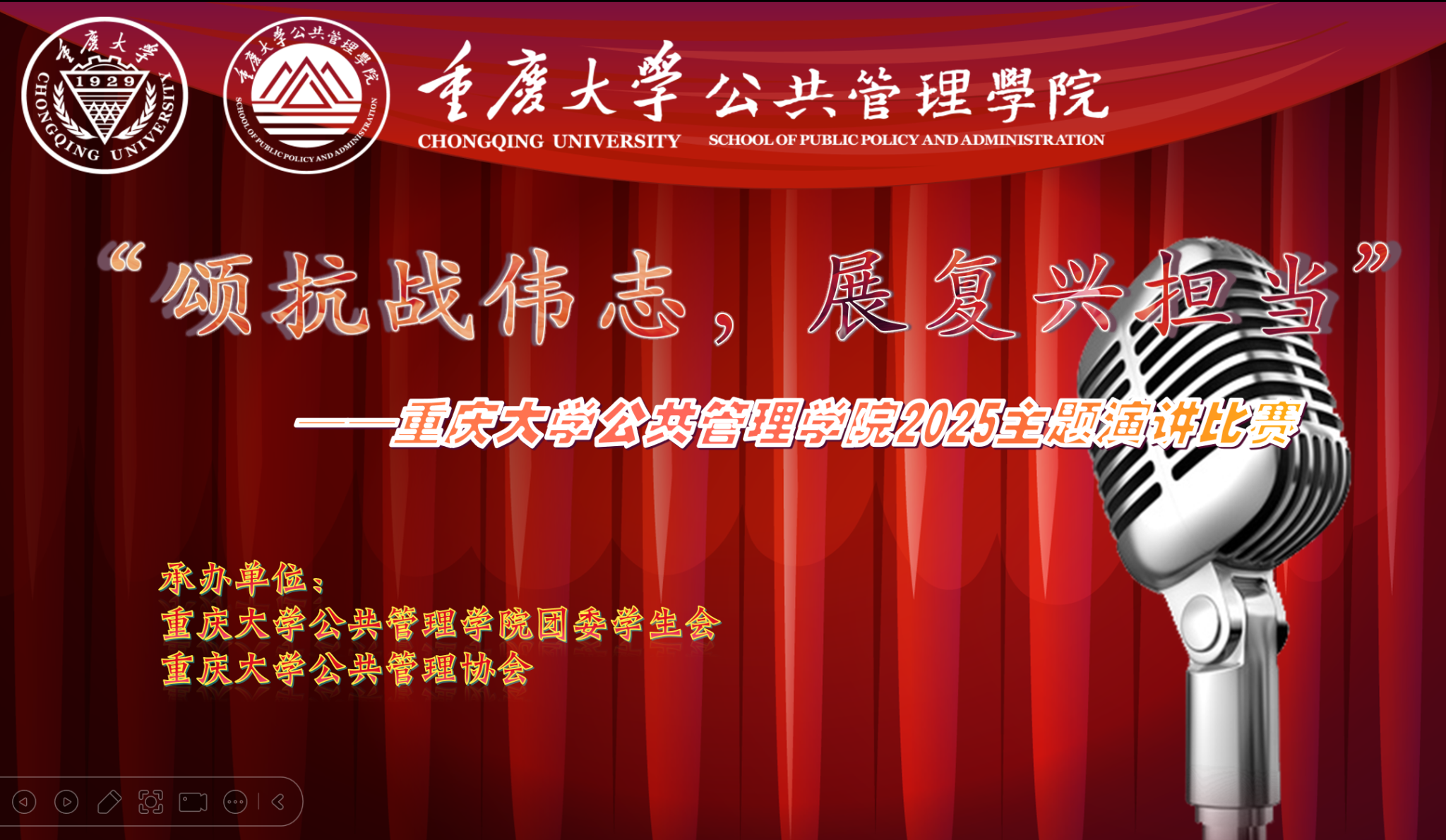 楼104教室成功举办了“诵抗战伟志,展复兴担当”主题演讲比赛。活动旨在重温抗战历史,弘扬爱国精神,激励广大学子肩负起新时代的复兴使命。