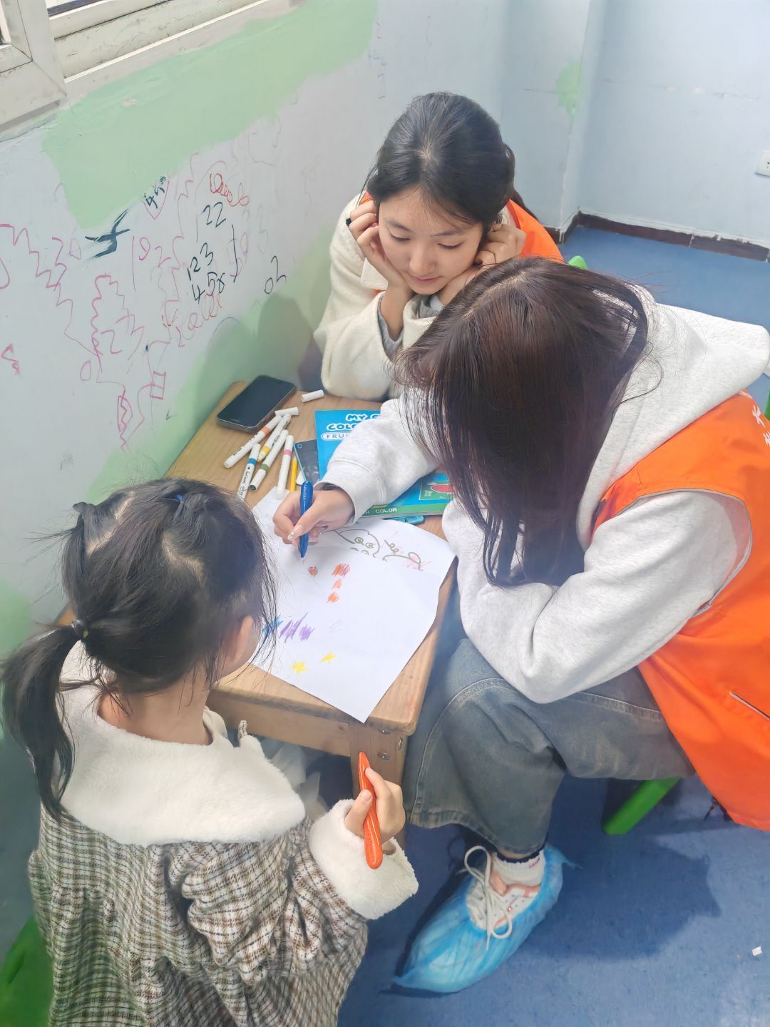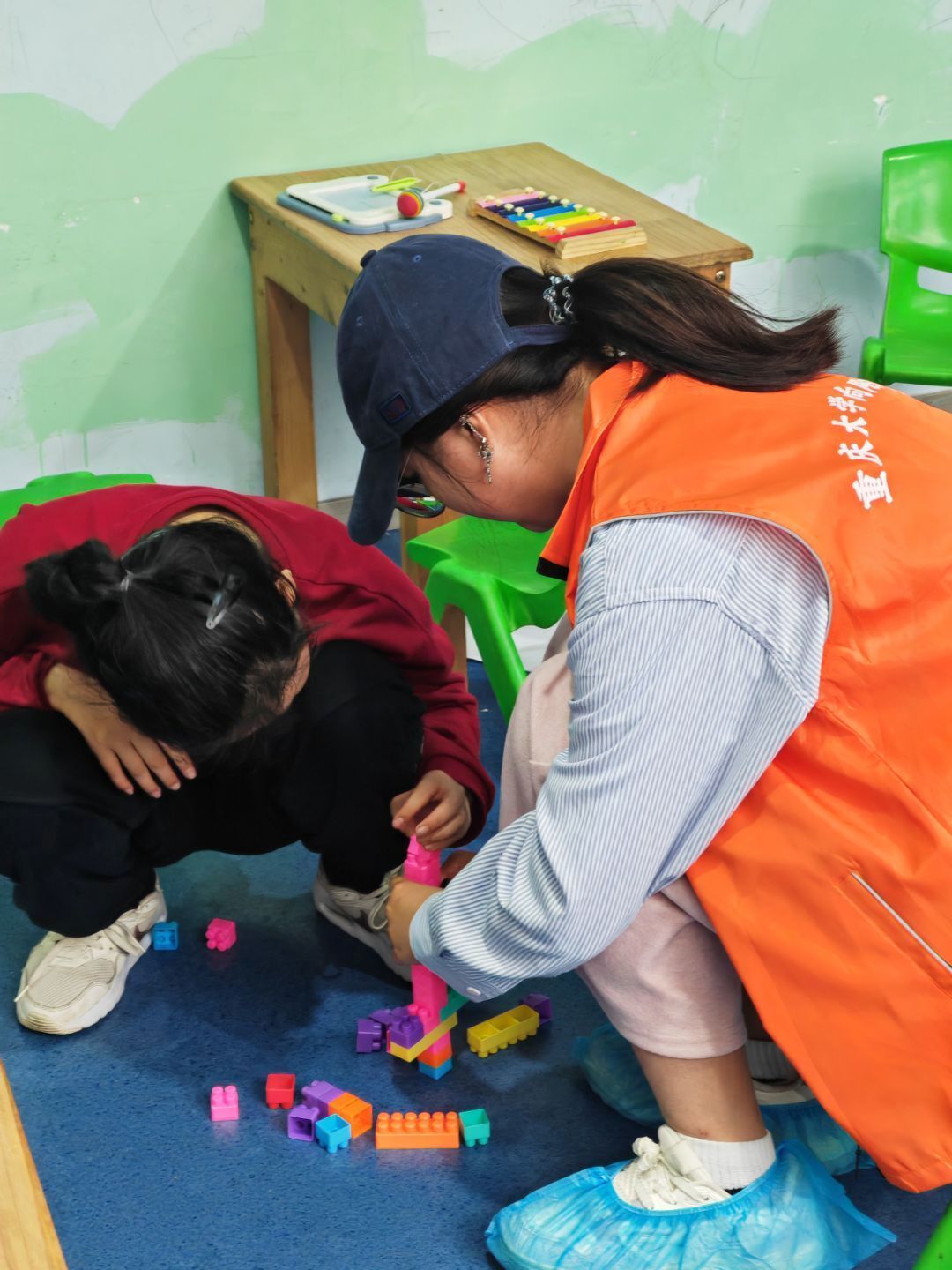 志愿者们与小朋友们和睦相处,在保证儿童安全的情况下通过绘画、运动、识字等游戏活动互动玩耍,都获得了一段不错的相处经历。小朋友们兴趣各异,有的用积木搭建自己的小天地,有的与志愿者敲打琴键,还有的更爱滑滑梯做游戏。