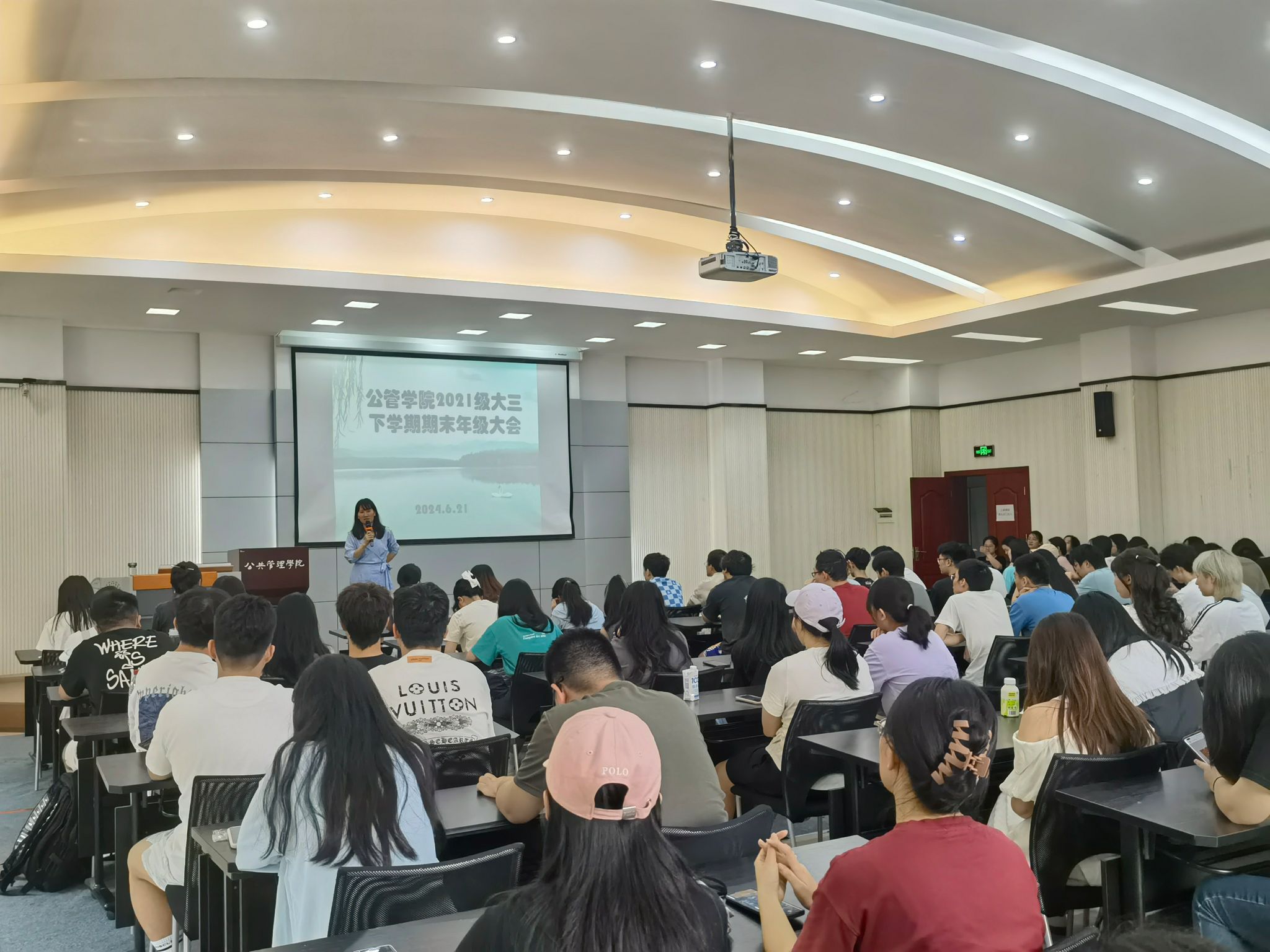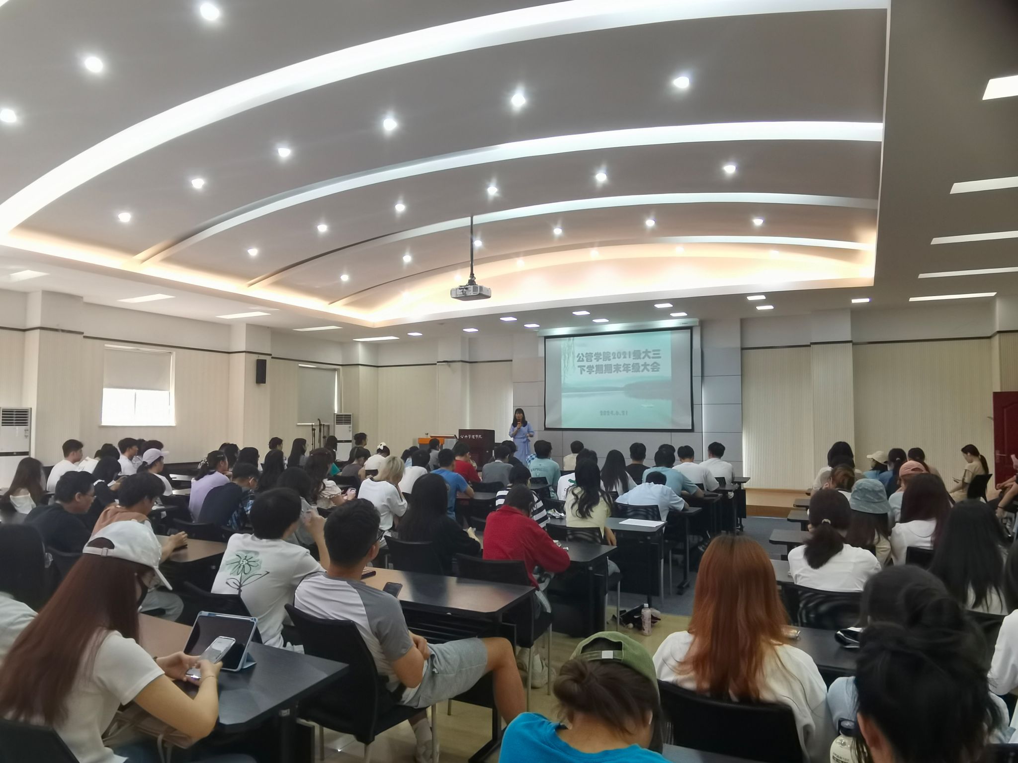 102多功能厅召开2021级本科生2023-2024学年第二学期期末年级大会暨就业升学规划指导大会。本次会议由2021级辅导员徐柳老师主持,2021级全体本科生到场参会。