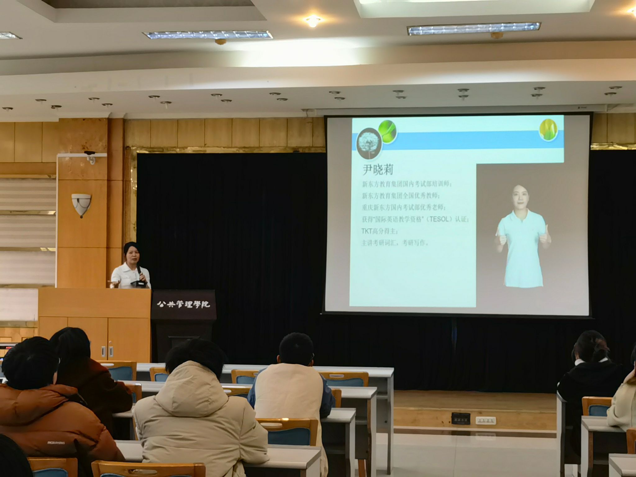 会议伊始,徐柳老师简要开场,向同学们介绍了2024和2025年考研的基本形势,并强调了科学合理规划考研的重要性。随后,引出了今天的主讲嘉宾,来自新东方教育集团的尹老师。尹老师在考研培训领域积累了丰富的经验,卓越的教学水平和专业知识深受往届学生好评。她成功辅导过许多学生取得优异的考研成绩,实现了高分上岸的目标。
