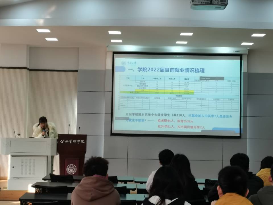 会上,徐老师对本院2022届本科生目前的就业情况和整体就业形势进行了梳理和分析,提醒和动员同学们利用好当前的春招小高峰,抓紧招聘和公考机会,同时鼓励同学们积极参加肉视频