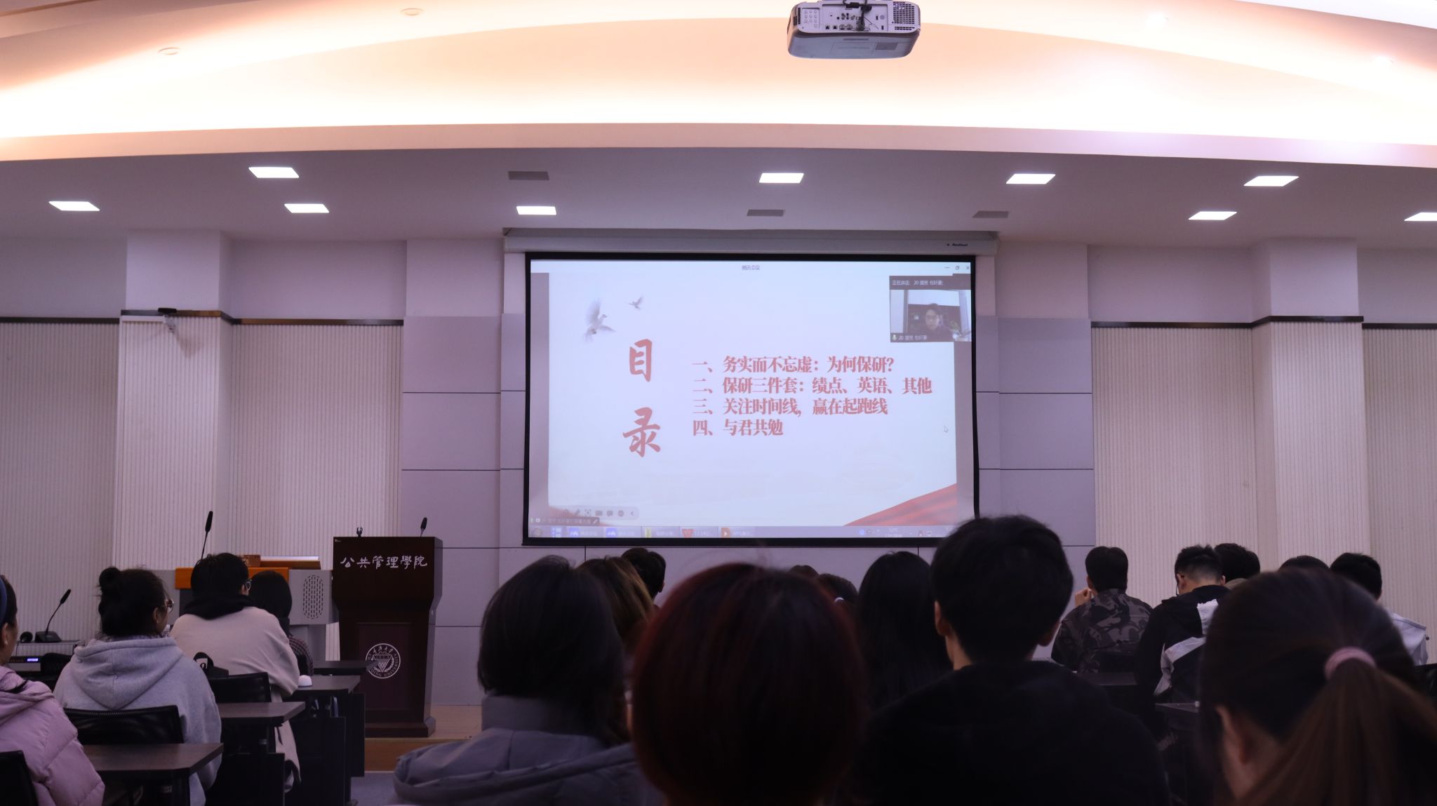 同样来自国际经济与贸易的王晓曼学姐从保研的具体路径出发,结合个人在保研路上面对的困难向学弟学妹们分享了保研经验。经济学专业的张源学长通过分享个人保研的时间线,鼓励学弟学妹们放平心态迎战保研。而来自行政管理专业政府与社会管理方向的郭佳良学长为同学们悉心整理准备了保研的数据,希望使同学们对如今的保研形势有更为清晰的认知,并分享了一个优秀保研案例以供同学们参考,最后郭佳良学长从自身出发向同学们提供了一些独到的保研建议。