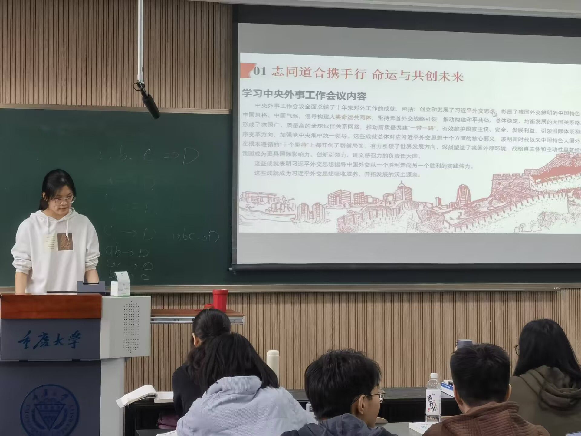 活动伊始,班级团支书姜熠首先向同学们详细讲解了中央外事工作会议内容。通过对我国外交领域的指导思想和实践成果的讲解,同学们对党的最新理论成果有了更加清晰的认识,更加坚定了跟党走的决心和信心。然后,团支书也为同学们讲解了中央外事工作会议的内容,她强调会议的主要内容是对于习近平外交思想的深刻理解和把握。鼓励同学们自学自学《中共中央关于进一步全面深化改革、推进中国式现代化的决定》。在讲解过程中,同学们认真倾听,专心学习,积极互动,踊跃发言,现场氛围浓厚。