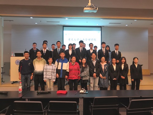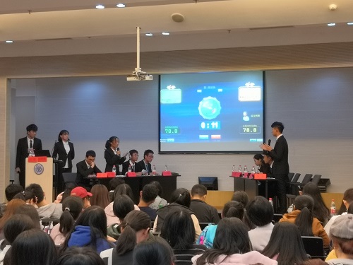 院辩论队队长张迁担任主持,副队长李露凝担任比赛计时员。