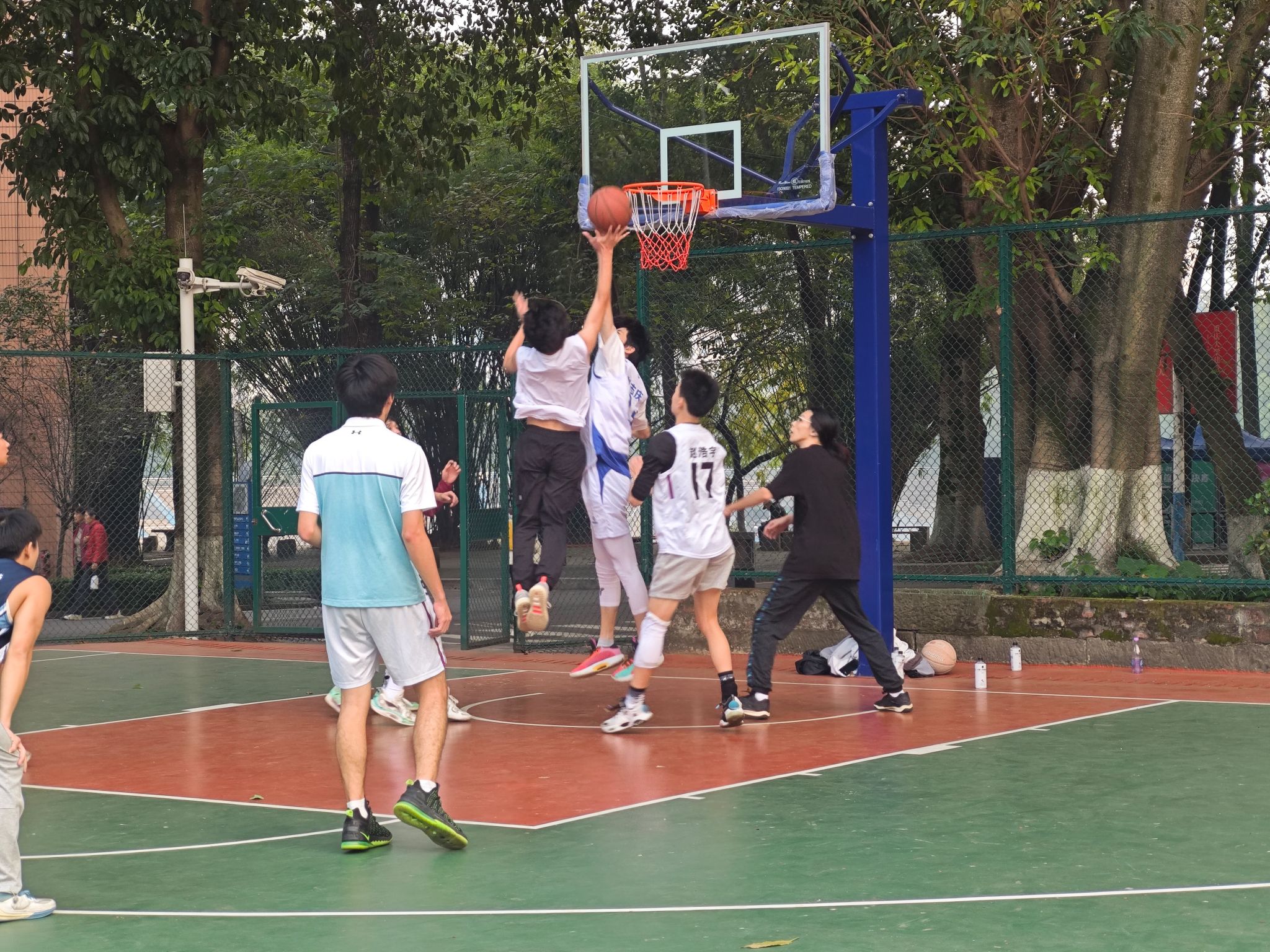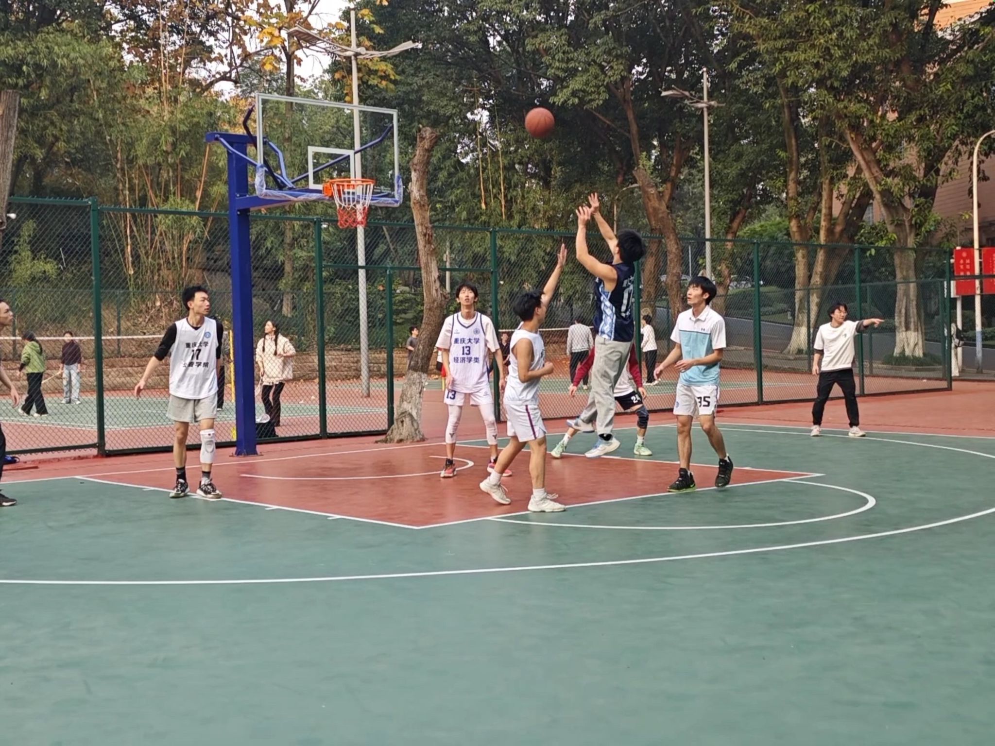 第五教学楼旁的篮球场激情上演。本次比赛的对阵双方分别为A组22级经济人资联队和B组22级国贸城管与23级国贸联队,他们秉持着竞技精神与对篮球的热忱汇聚于此,续写篮球场上的热血篇章,为校园注入蓬勃朝气与运动活力。
