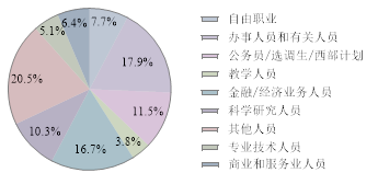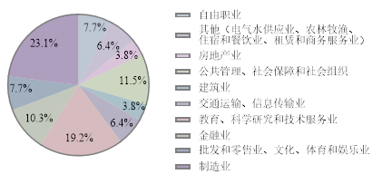 本科毕业生中公务员/选调生/西部计划共9人,占就业总数的12%,分布地区较为零散;金融/经济业务人员13人,占比17%,主要是金融业和制造业;专业技术人员为4人,分布在建筑业、公共管理和电气水供应业;有办事人员和相关人员14人,大多数在制造业,其余分散在批发零售、电气水供应业等等;有科学研究人员8人,均任科研助理;教学人员3人,2人在教育培训机构,1人在中学;另有商业服务人员5人,行业分布各不相同;其他人员16人,主要分布在建筑业、制造业和信息传输业;还有自由职业6人,从事如财务、教培、写作等方面工作。