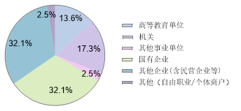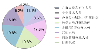 科研助理11人,各地教育培训机构教学人员4人,中小学教师1人;另有商业服务人员5人,行业分布各不相同,在房地产业、批发零售业等;其他人员13人,一半分布在建筑业和交通运输业,其余则分布广泛;还有自由职业1人,从事体育教练工作。