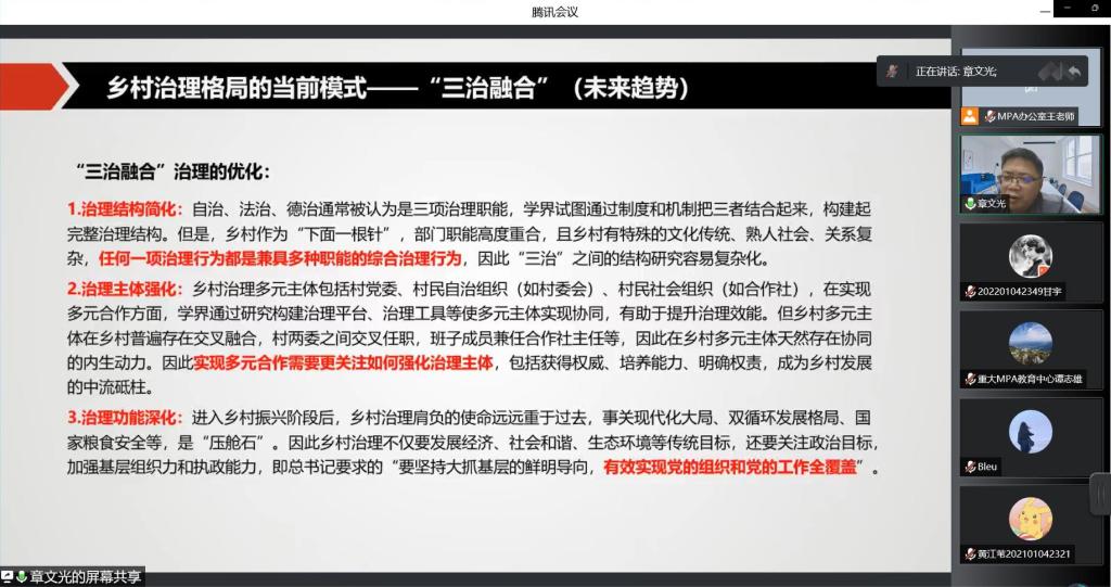院长章文光教授分享《基于社会主要矛盾变化的乡村治理格局演化》为主题的讲座。