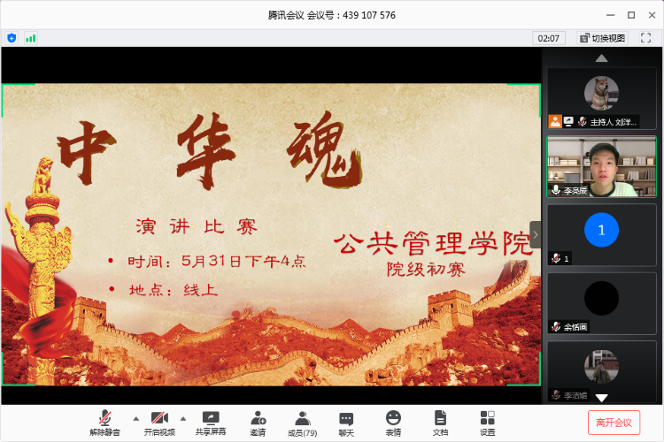 2020-06-08为深入引导青年学生讲好党的故事、中国故事、青年故事,进一步激发青年学生的爱国之情,强化爱国之志,2019年5月31日下午4点,肉视频 “中华魂”主题教育肉视频 演讲比赛初赛,通过线上腾讯会议如期举行。学办主任兼18、19级辅导员王丽娟、辅导员助理谢镇江出席观看本次演讲比赛,团委学生会主席团担任评委,18、19级同学们准时上线,为参赛选手加油打气。本次比赛共有12名同学参与。由19级经济2班刘洋主持。经过主持人的开场...